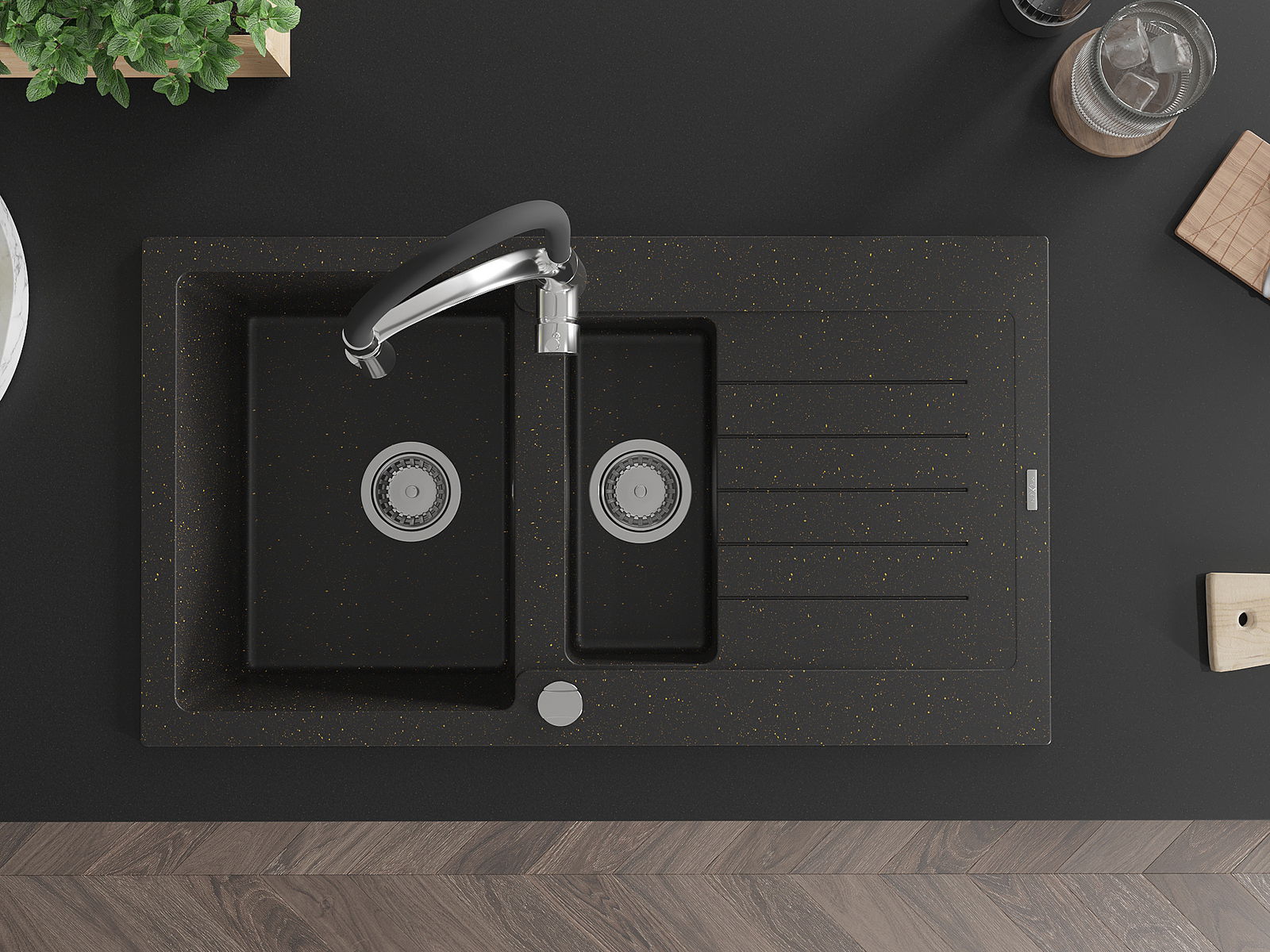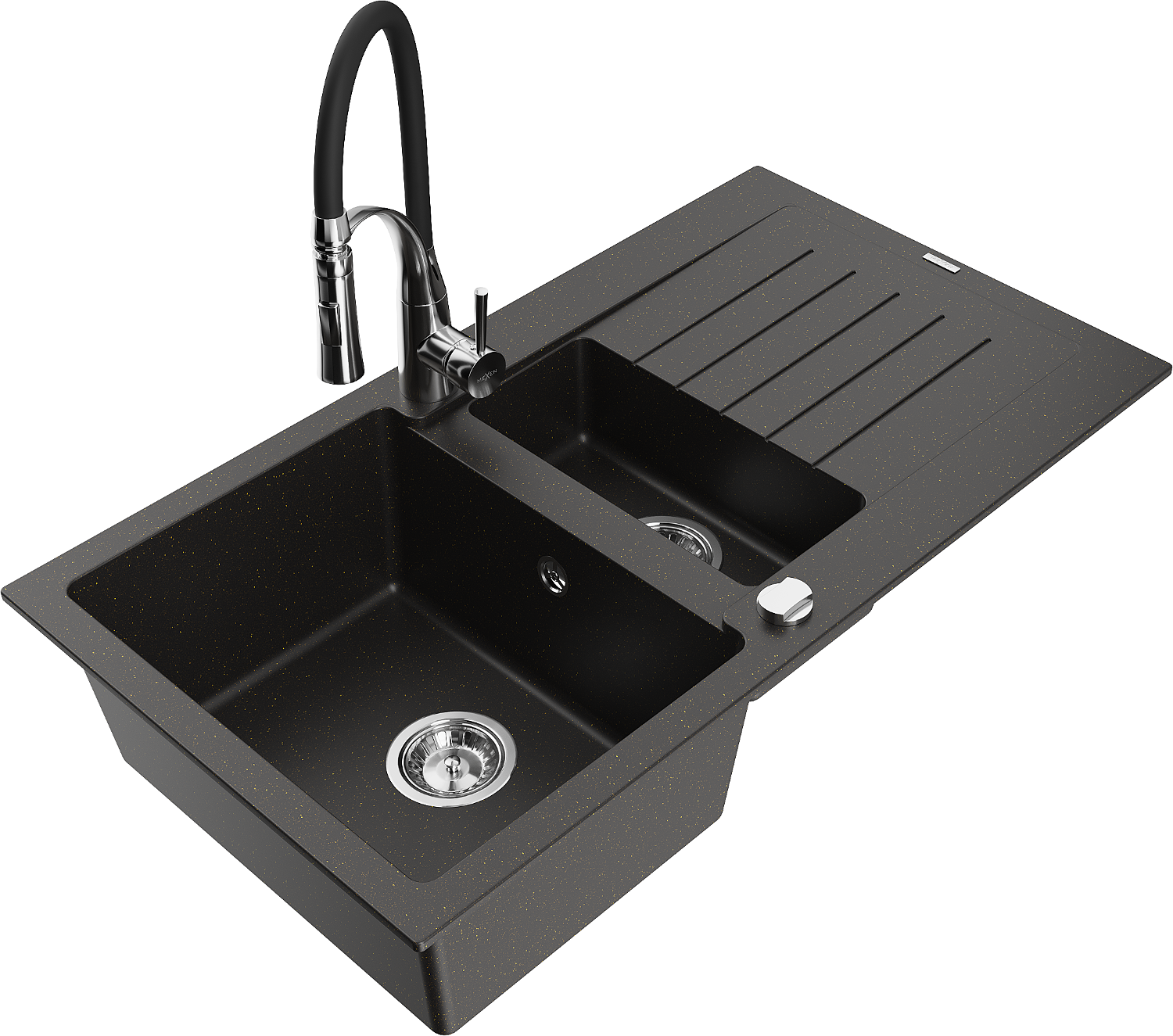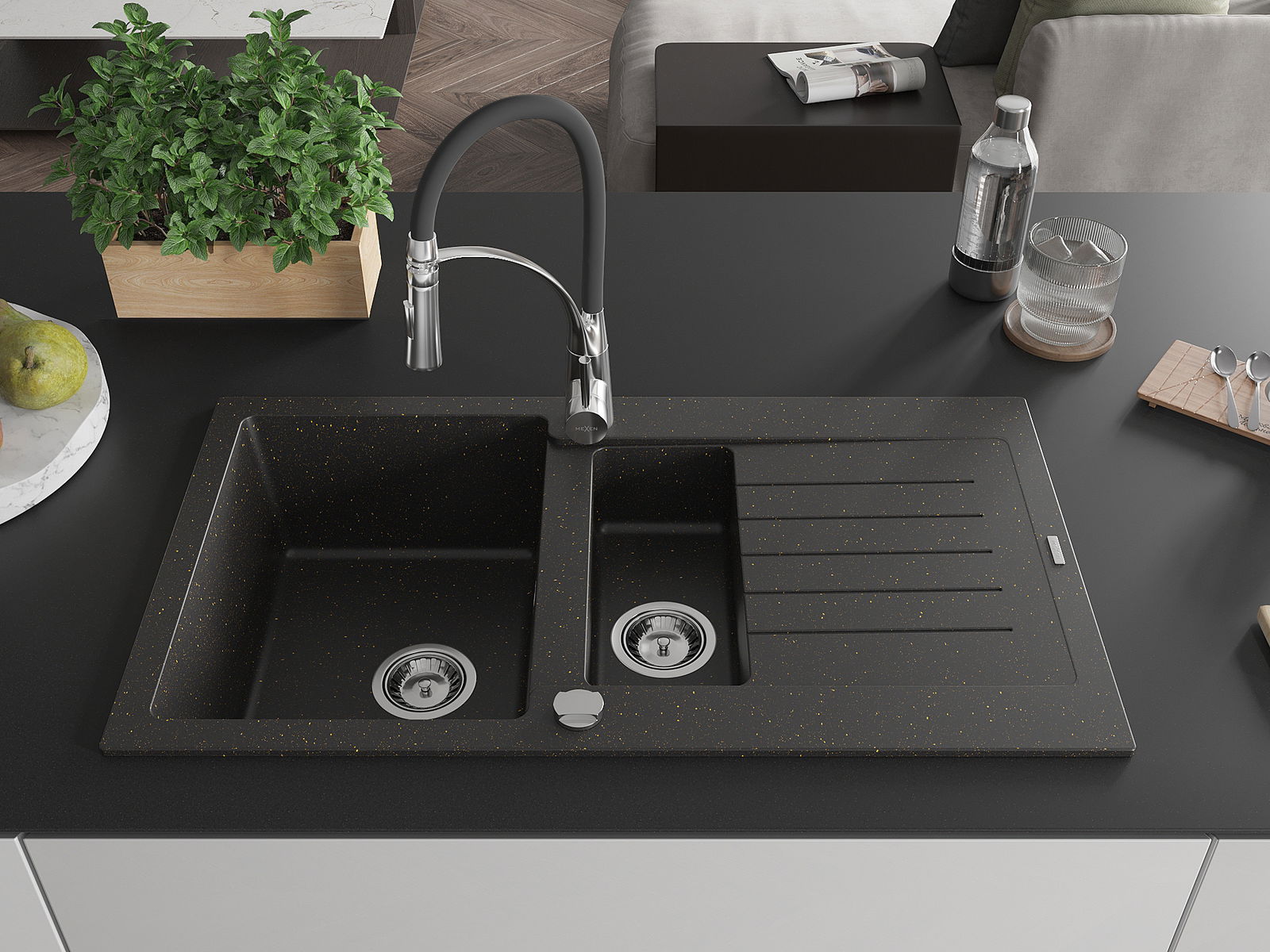 Mexen Matias évier en granit 1,5 bac avec égouttoir et robinet de cuisine Aster, noir/or métal - 6502-75-73450-07