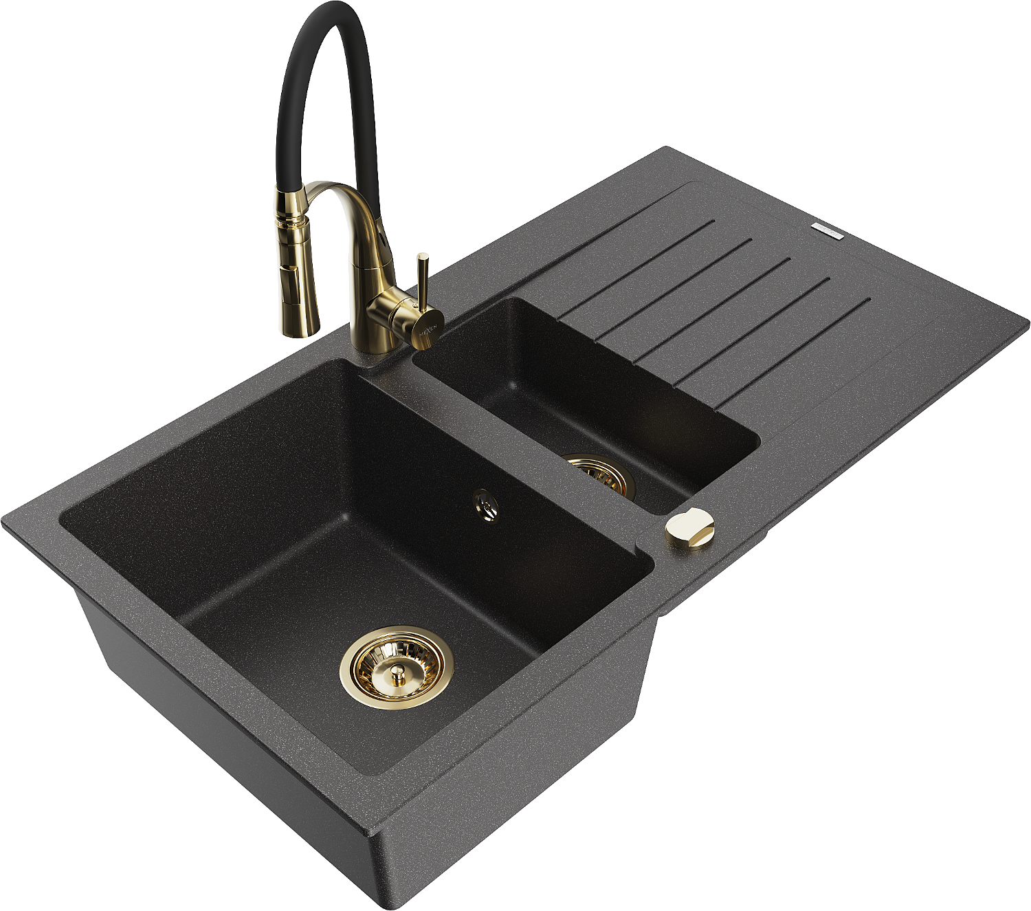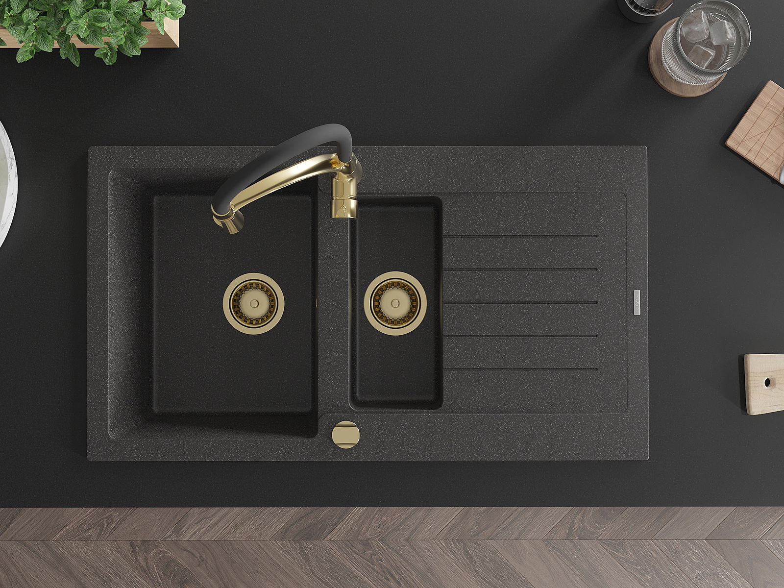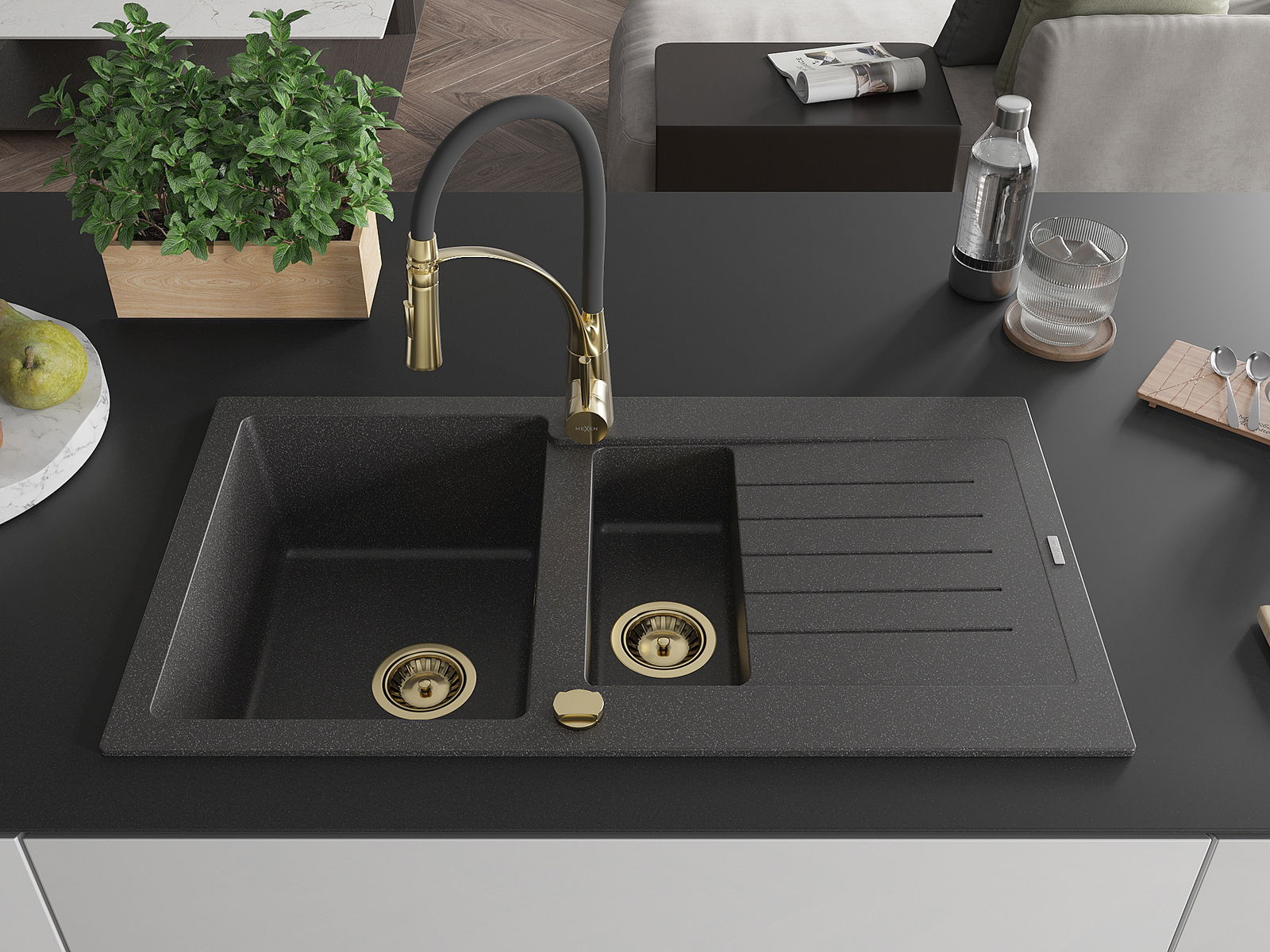 Mexen Matias évier en granit 1,5 bac avec égouttoir et mitigeur de cuisine Aster, noir moucheté - 6502-76-73450-57-G