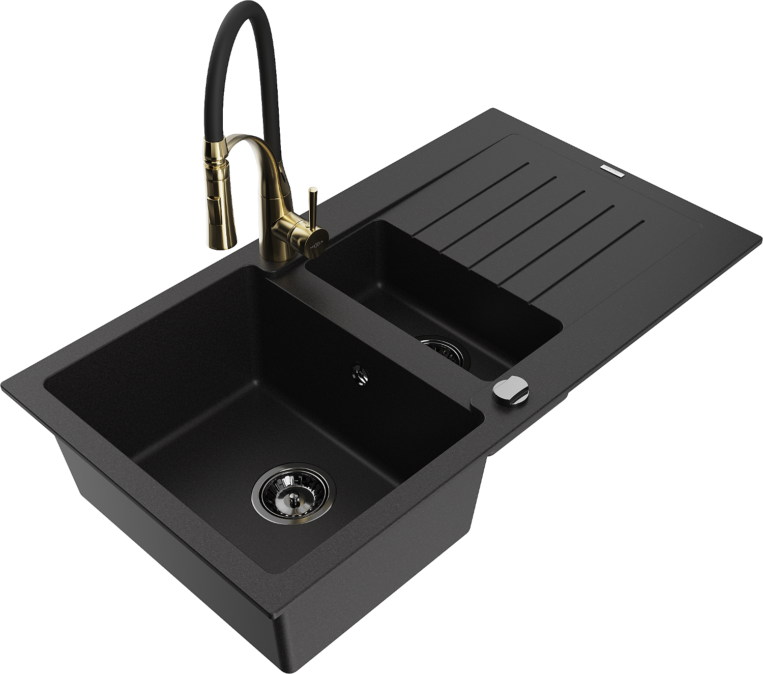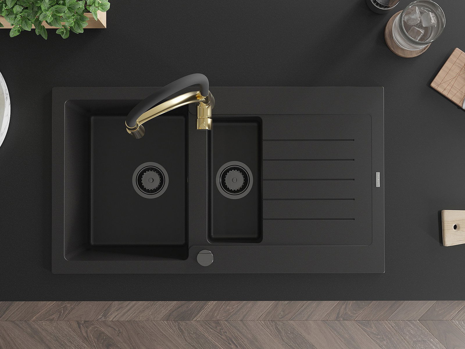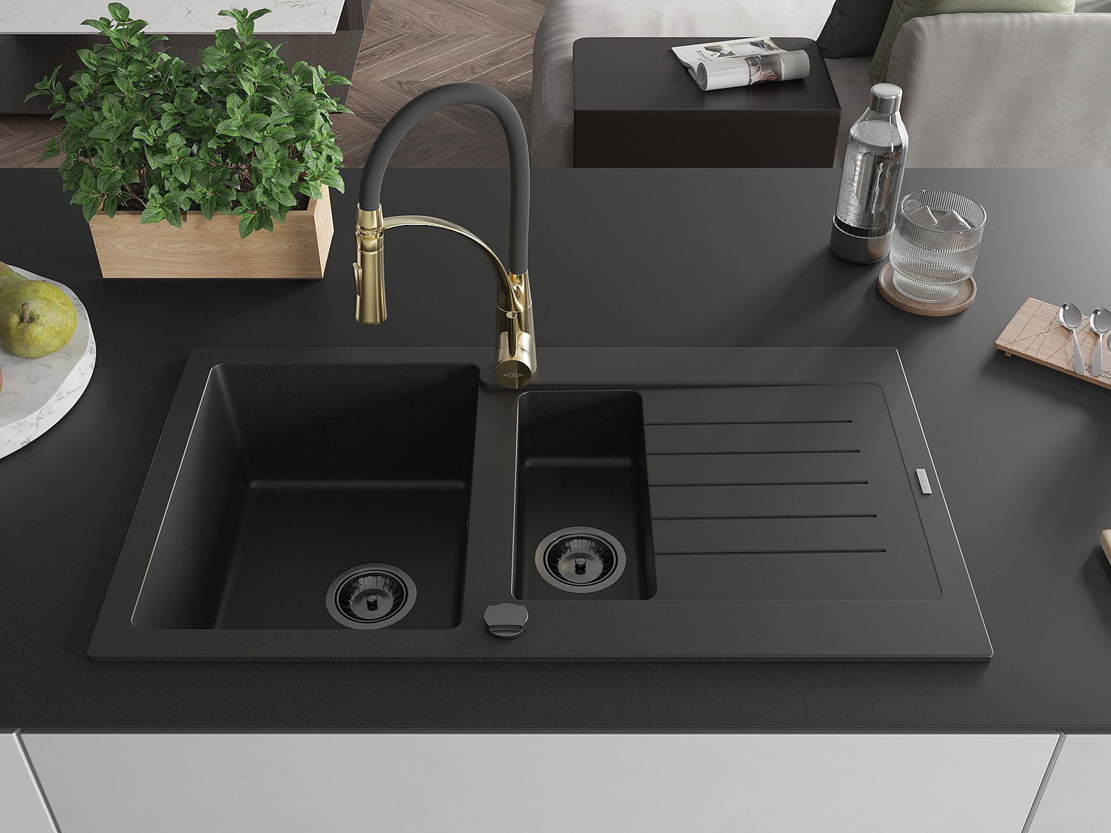 Mexen Matias évier en granit 1,5 bac avec égouttoir et robinet de cuisine Aster, noir - 6502-77-73450-57-B