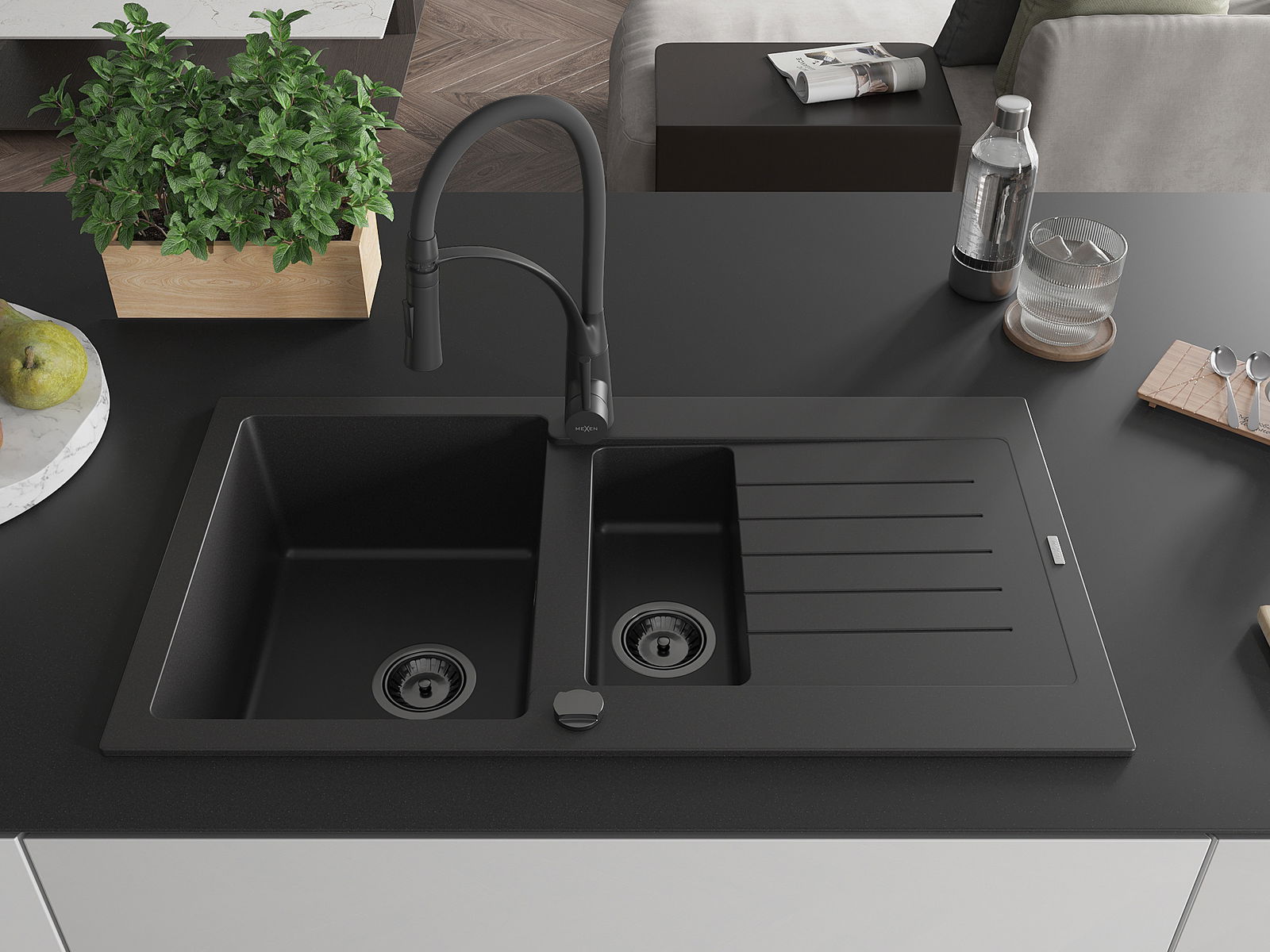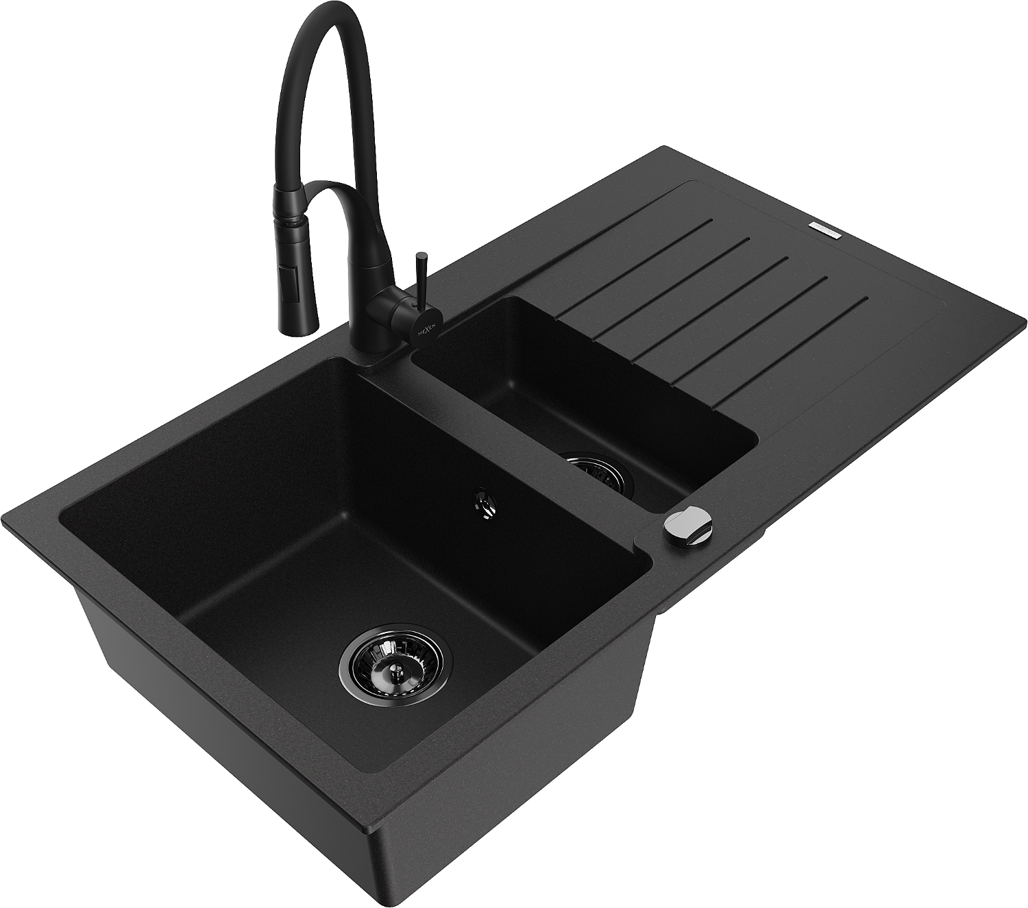 Mexen Matias évier en granit 1,5-bac avec égouttoir et mitigeur de cuisine Aster, noir - 6502-77-73450-70-B