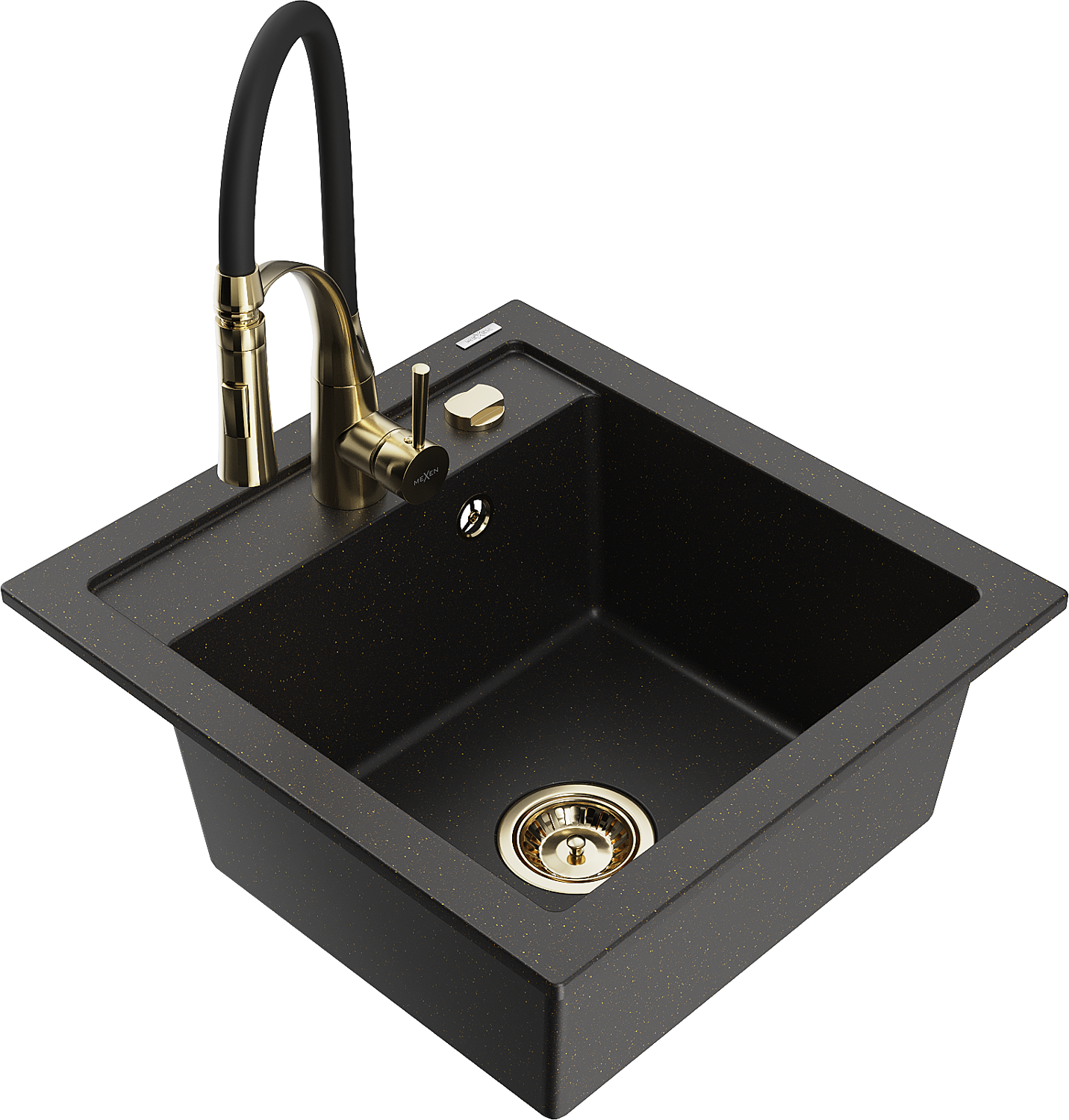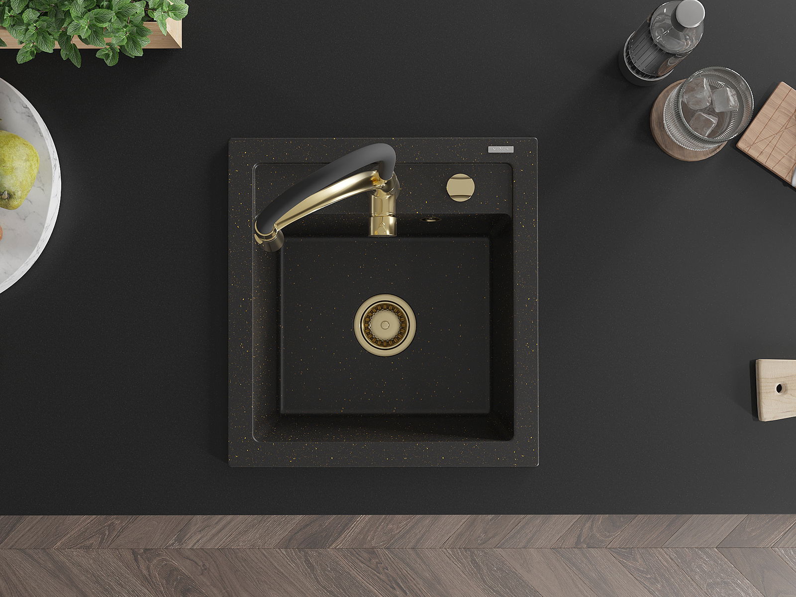 Mexen Vito évier en granit 1 bac avec robinet de cuisine Aster, noir/or métallique- 6503-75-73450-57-G