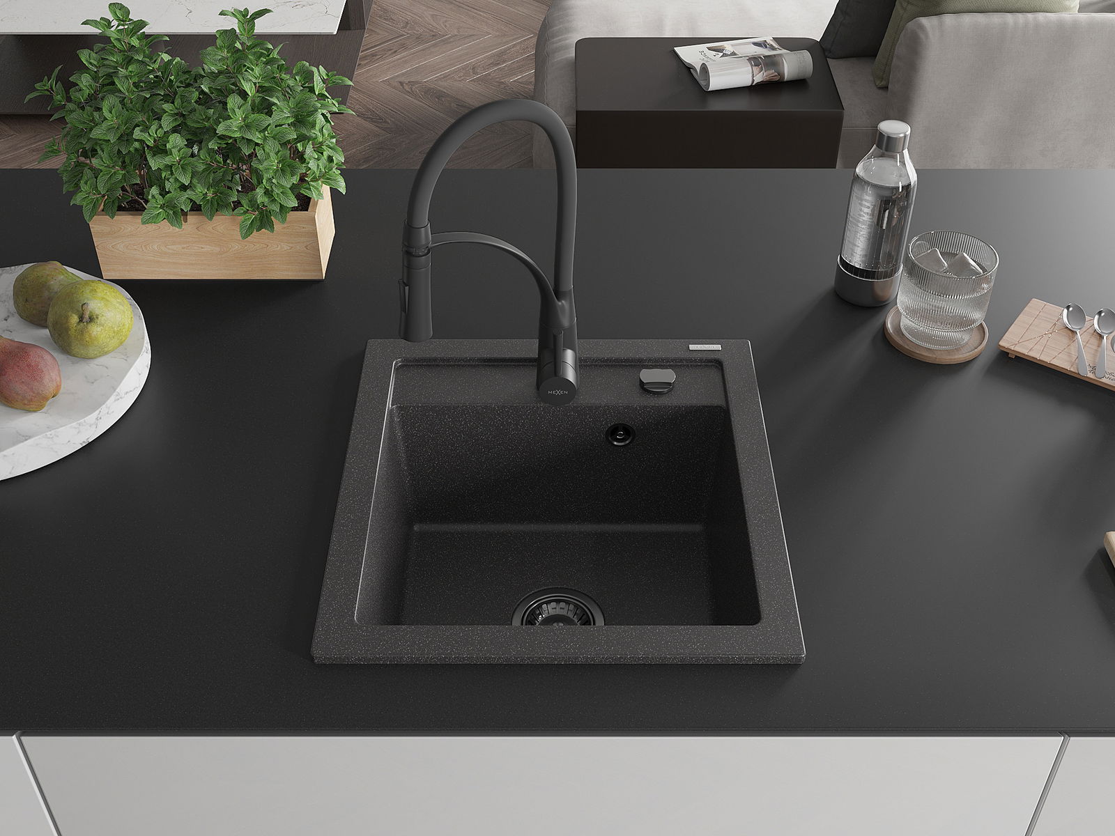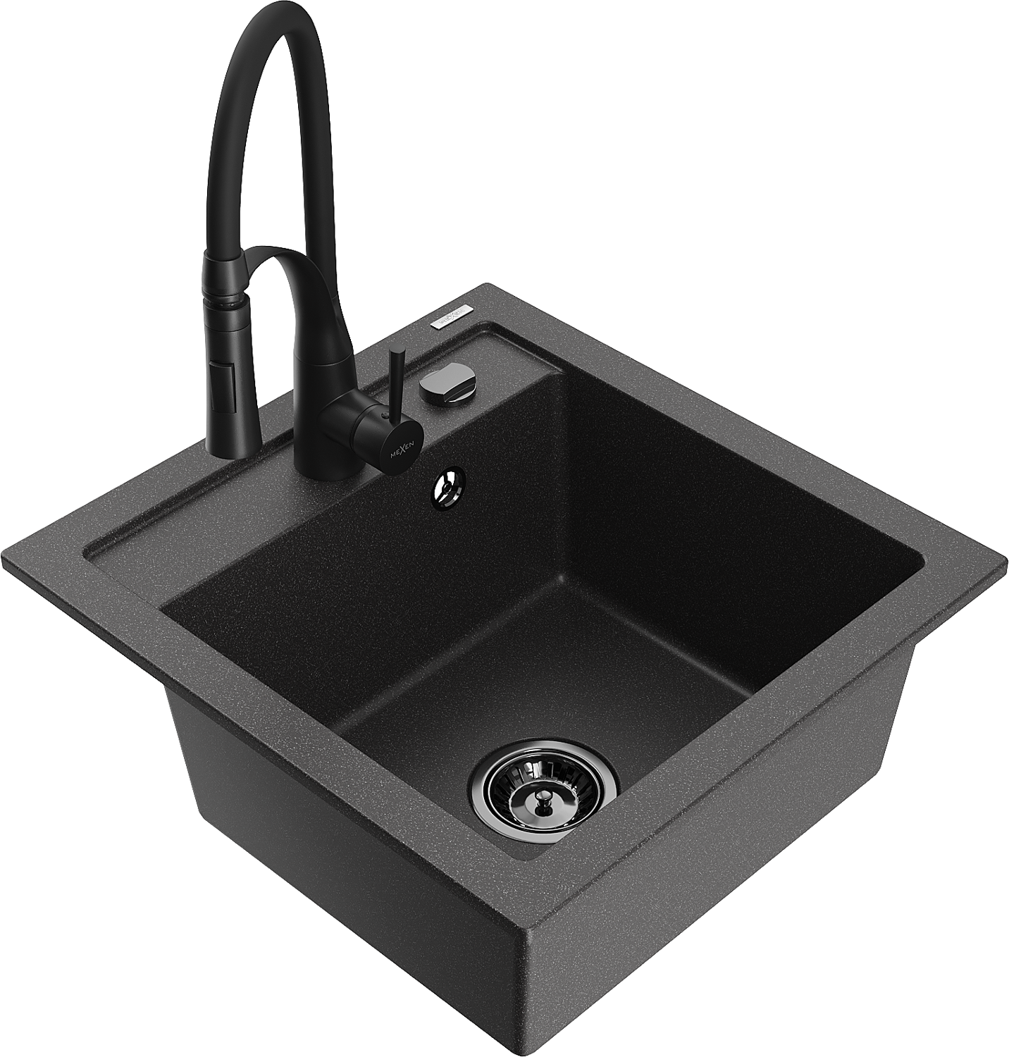 Mexen Vito évier en granit à 1 bac avec robinet de cuisine Aster, noir moucheté - 6503-76-73450-70-B