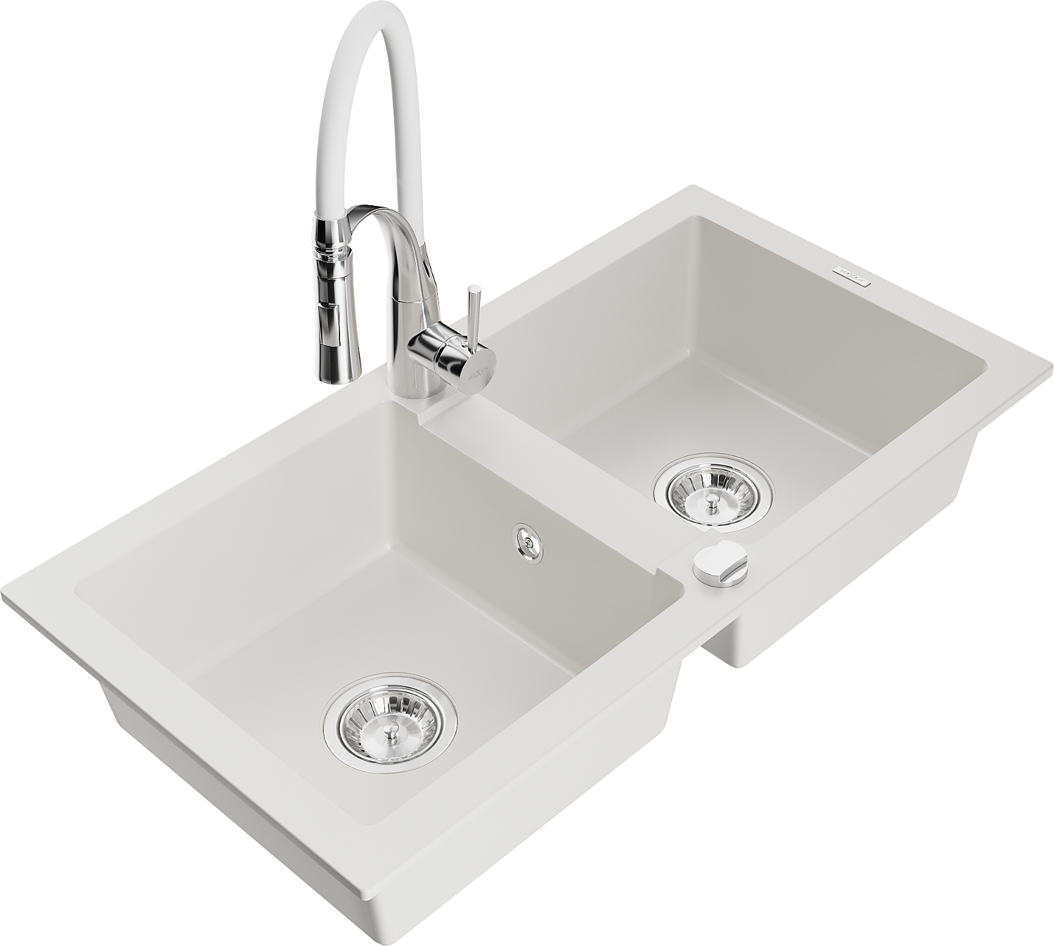 Mexen Mario évier en granit à 2 bacs avec robinet de cuisine Aster, blanc - 6504-20-73450-02