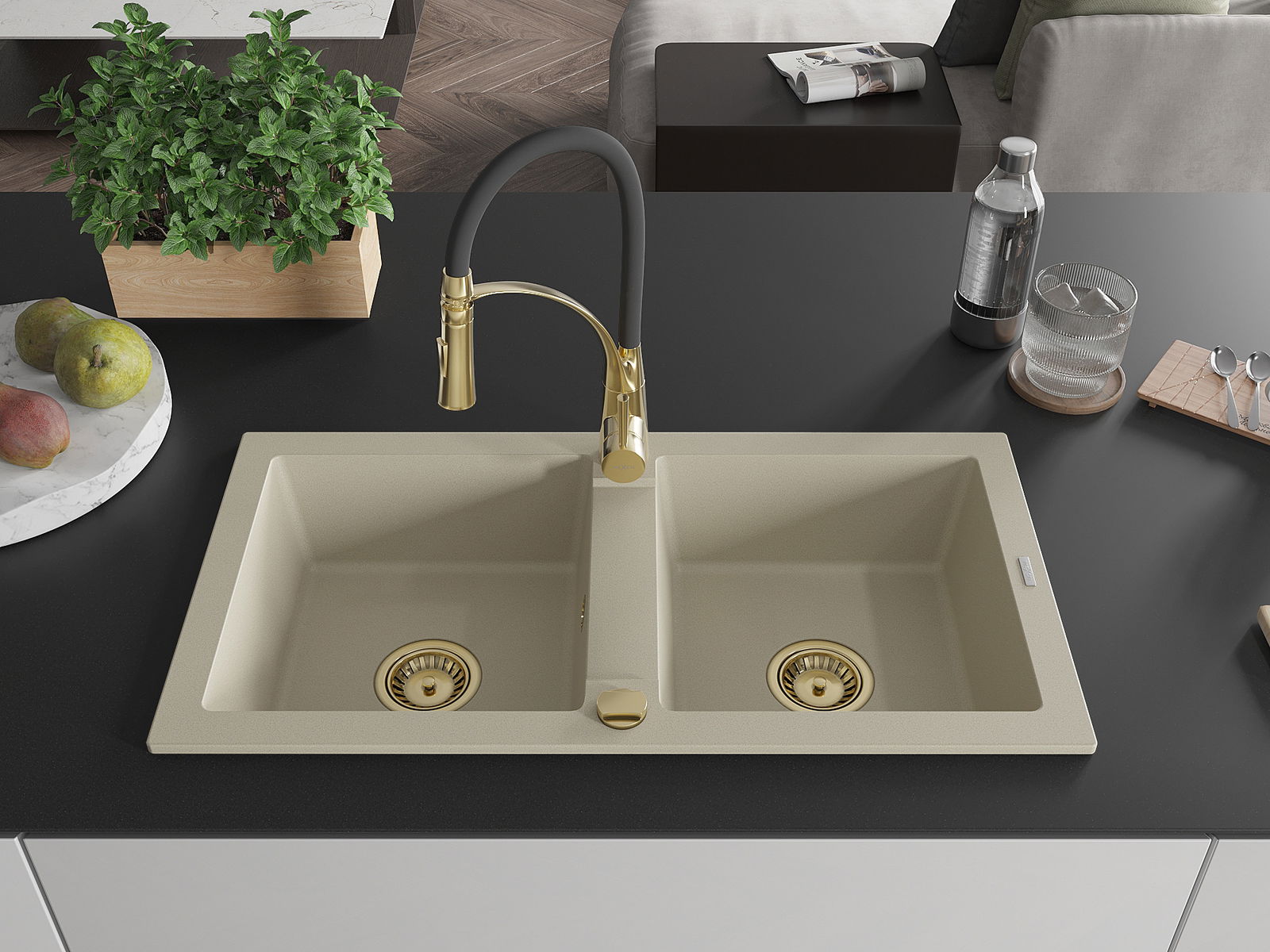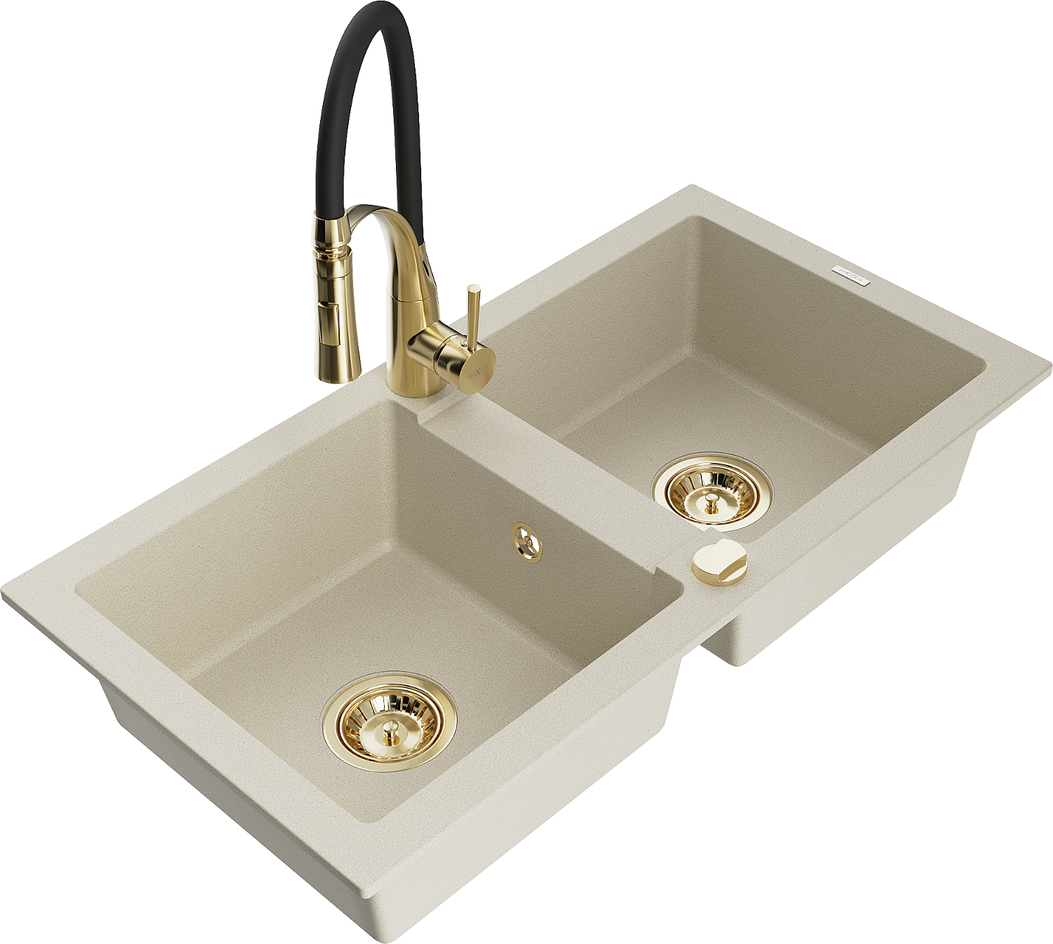 Mexen Mario évier granitique à 2 bacs avec robinet de cuisine Aster, beige - 6504-69-73450-57-G