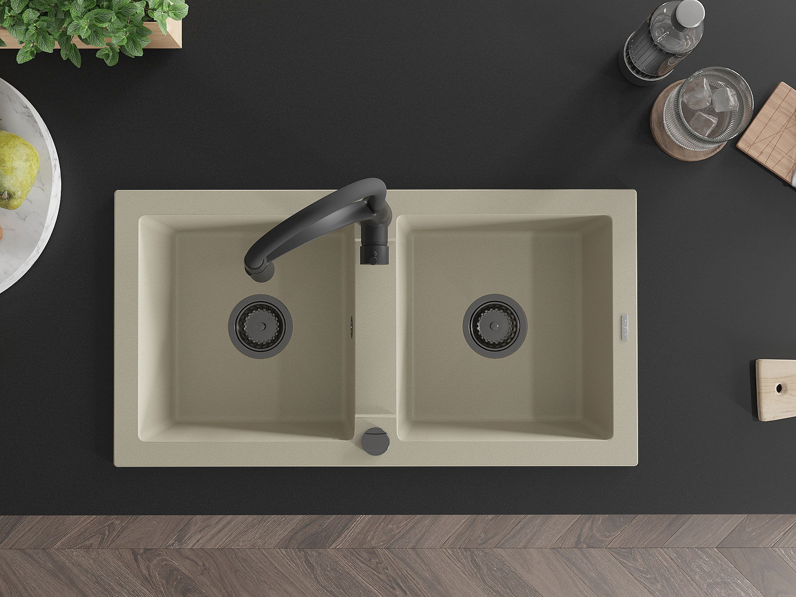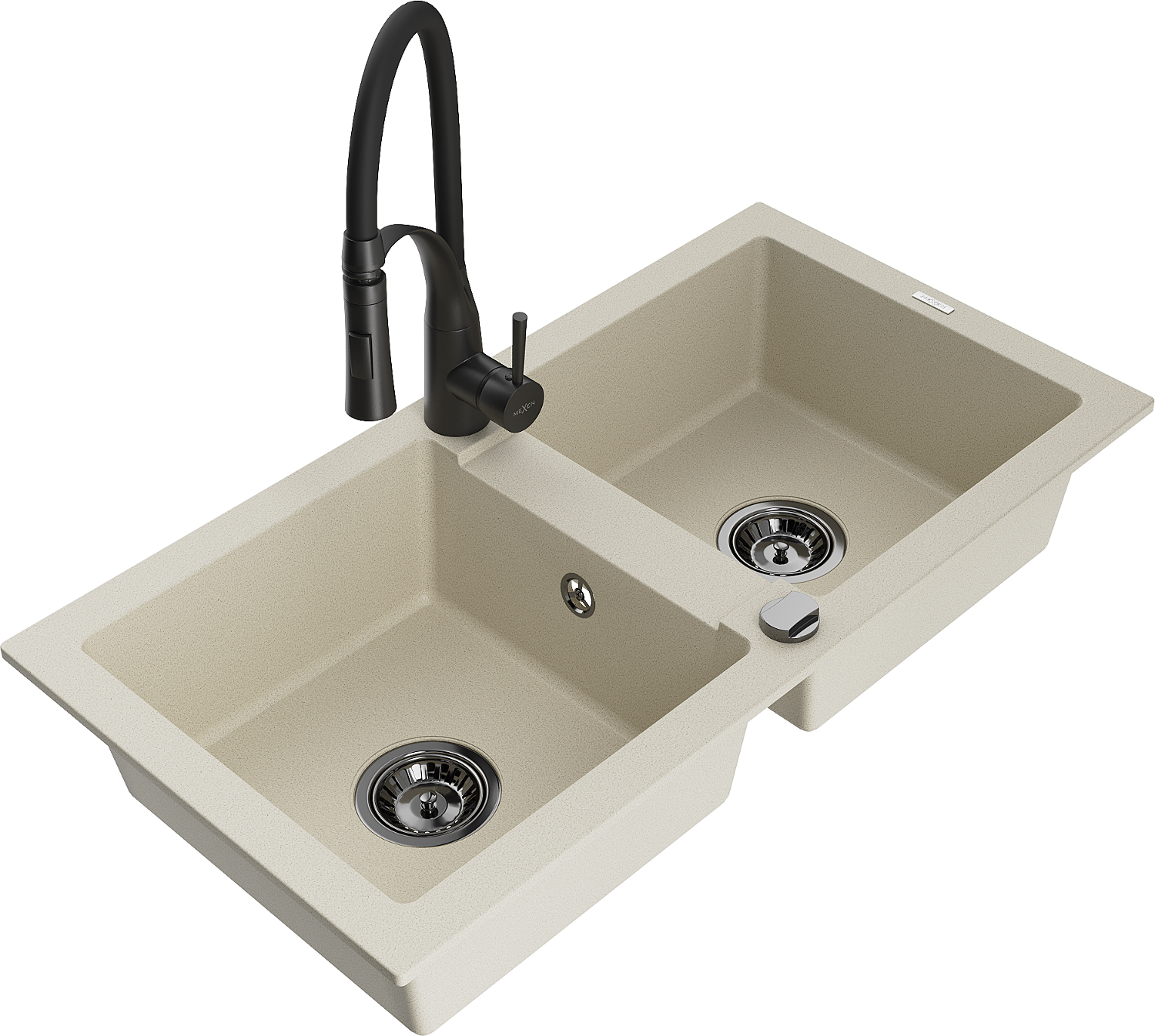 Mexen Mario évier en granit à 2 cuves avec mitigeur de cuisine Aster, beige - 6504-69-73450-70-B