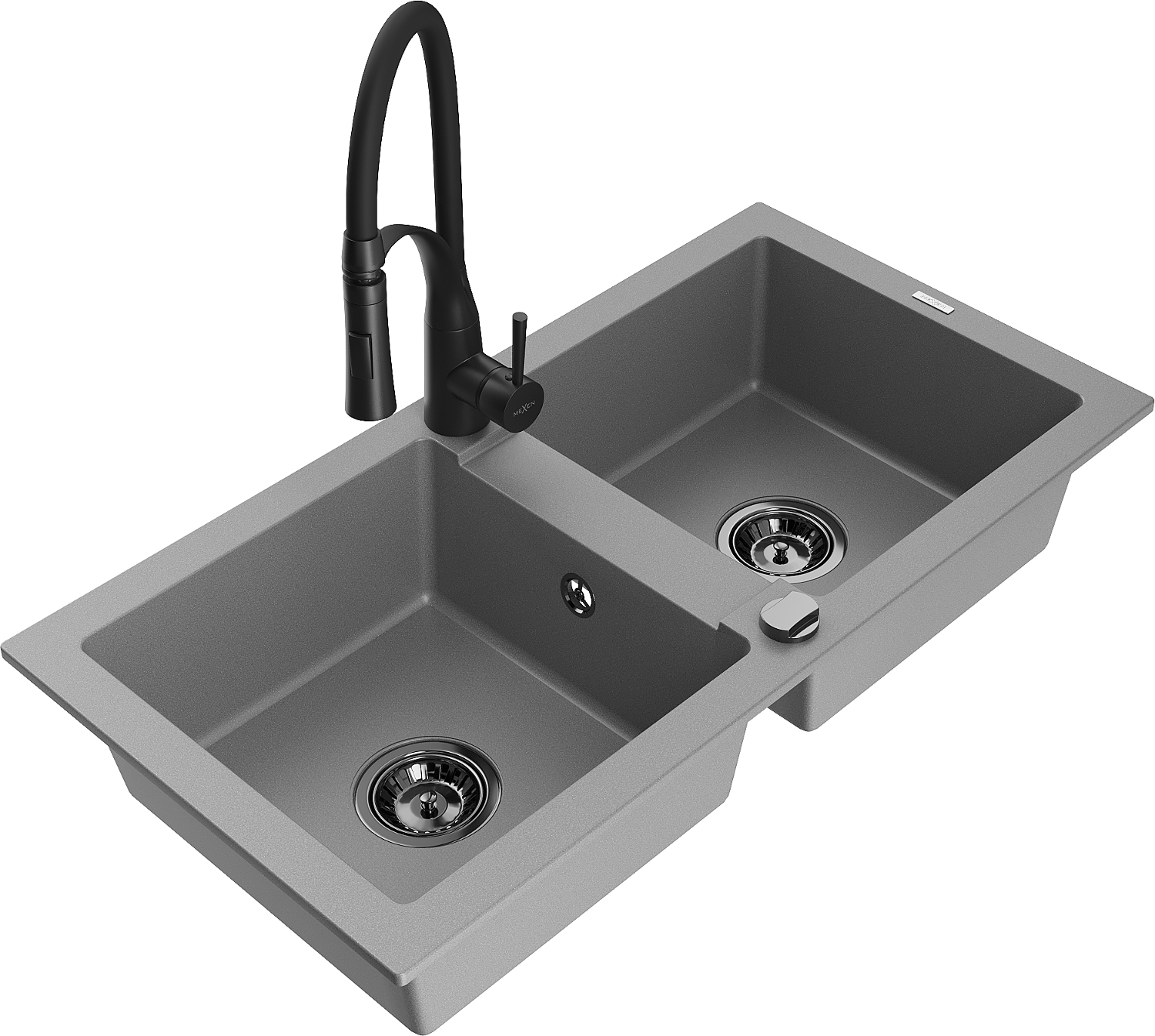 Mexen Mario évier en granit à 2 bacs avec robinet de cuisine Aster, gris - 6504-71-73450-70-B