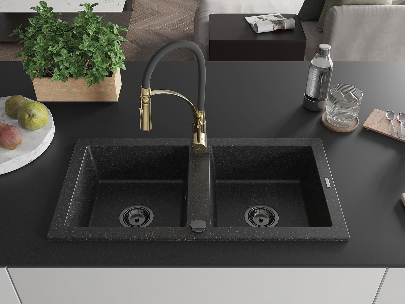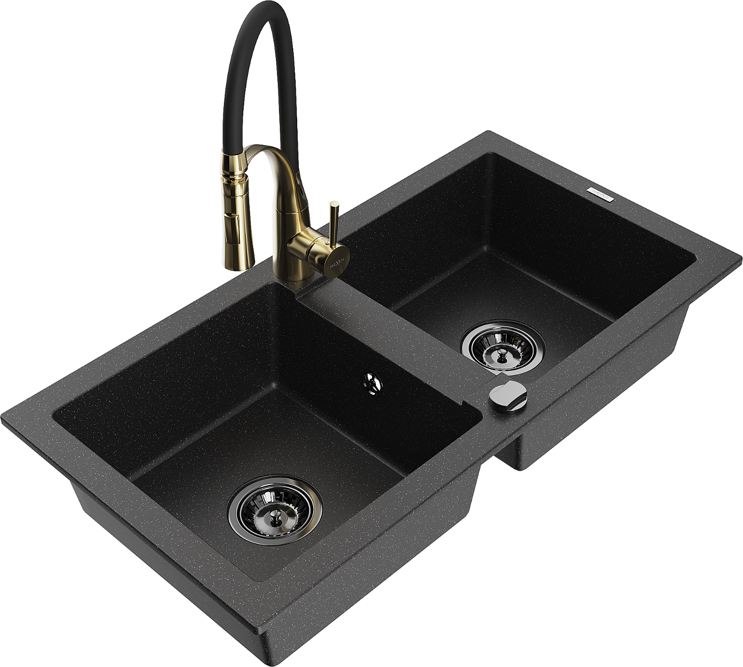 Mexen Mario évier en granit 2 bacs avec robinet de cuisine Aster, noir/argent métallique - 6504-73-73450-57-B