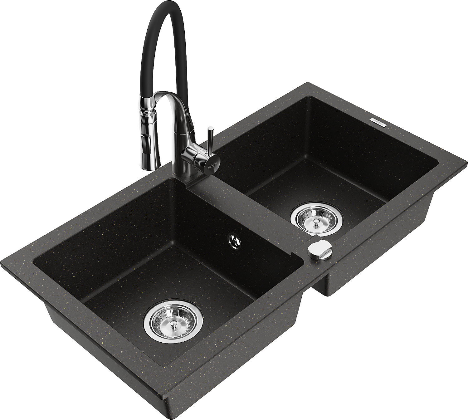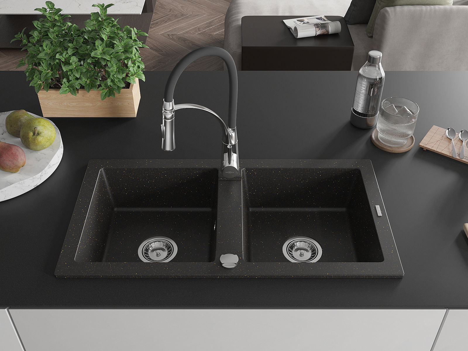 Mexen Mario évier en granit à 2 bacs avec robinet de cuisine Aster, noir/métallisé doré - 6504-75-73450-07