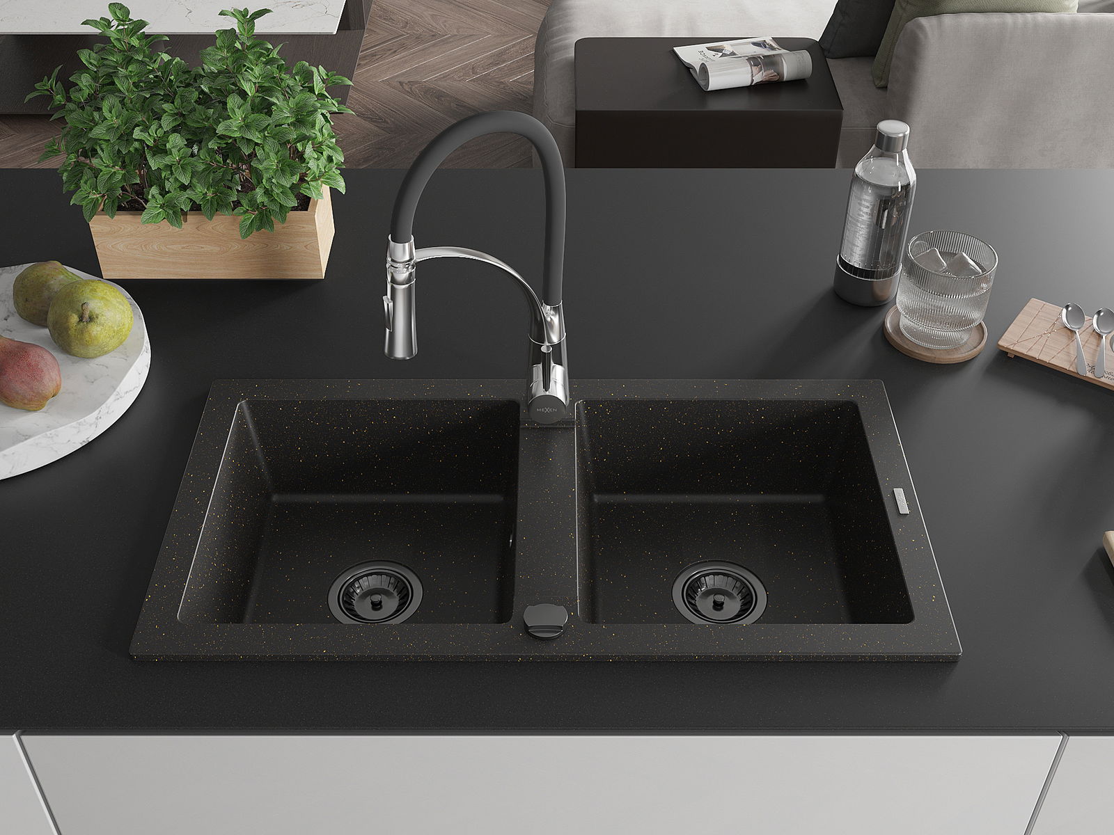 Mexen Mario évier en granit à 2 bacs avec robinet de cuisine Aster, noir/métallisé doré - 6504-75-73450-07-B