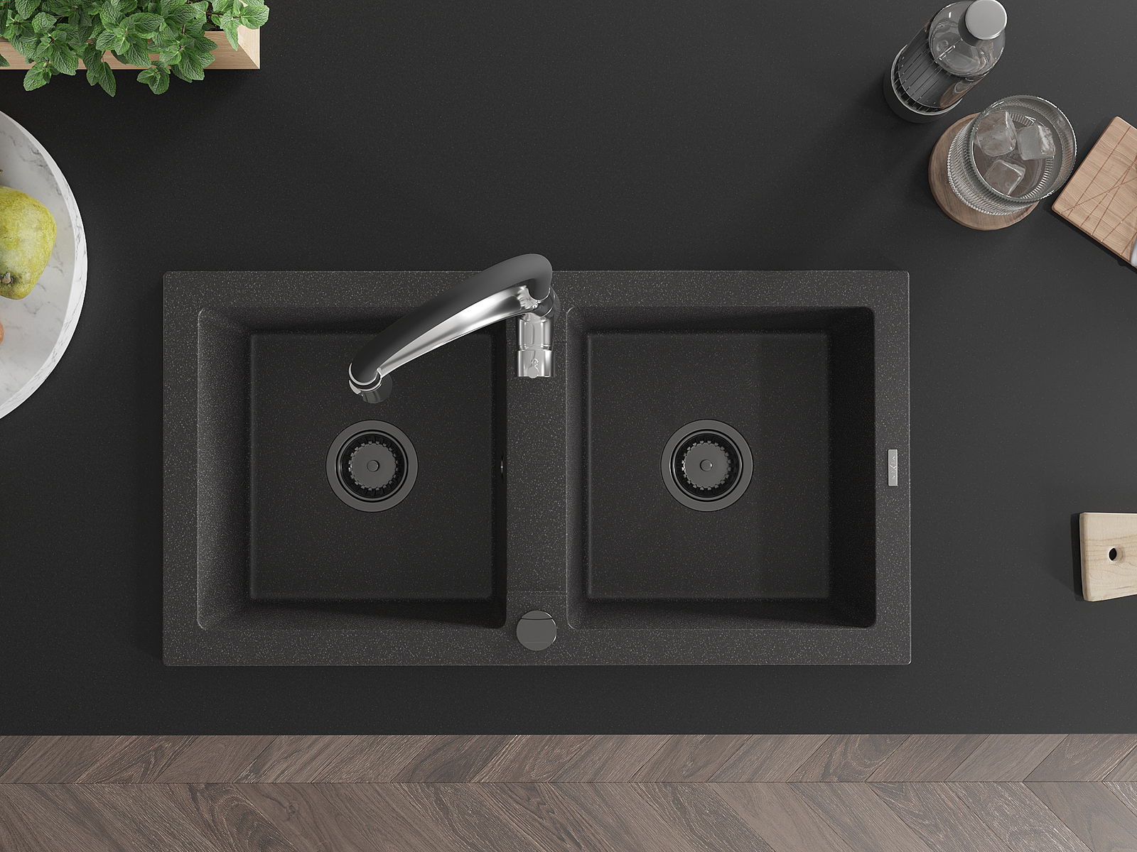 Mexen Mario évier en granit 2 bacs avec mitigeur de cuisine Aster, noir moucheté - 6504-76-73450-07-B