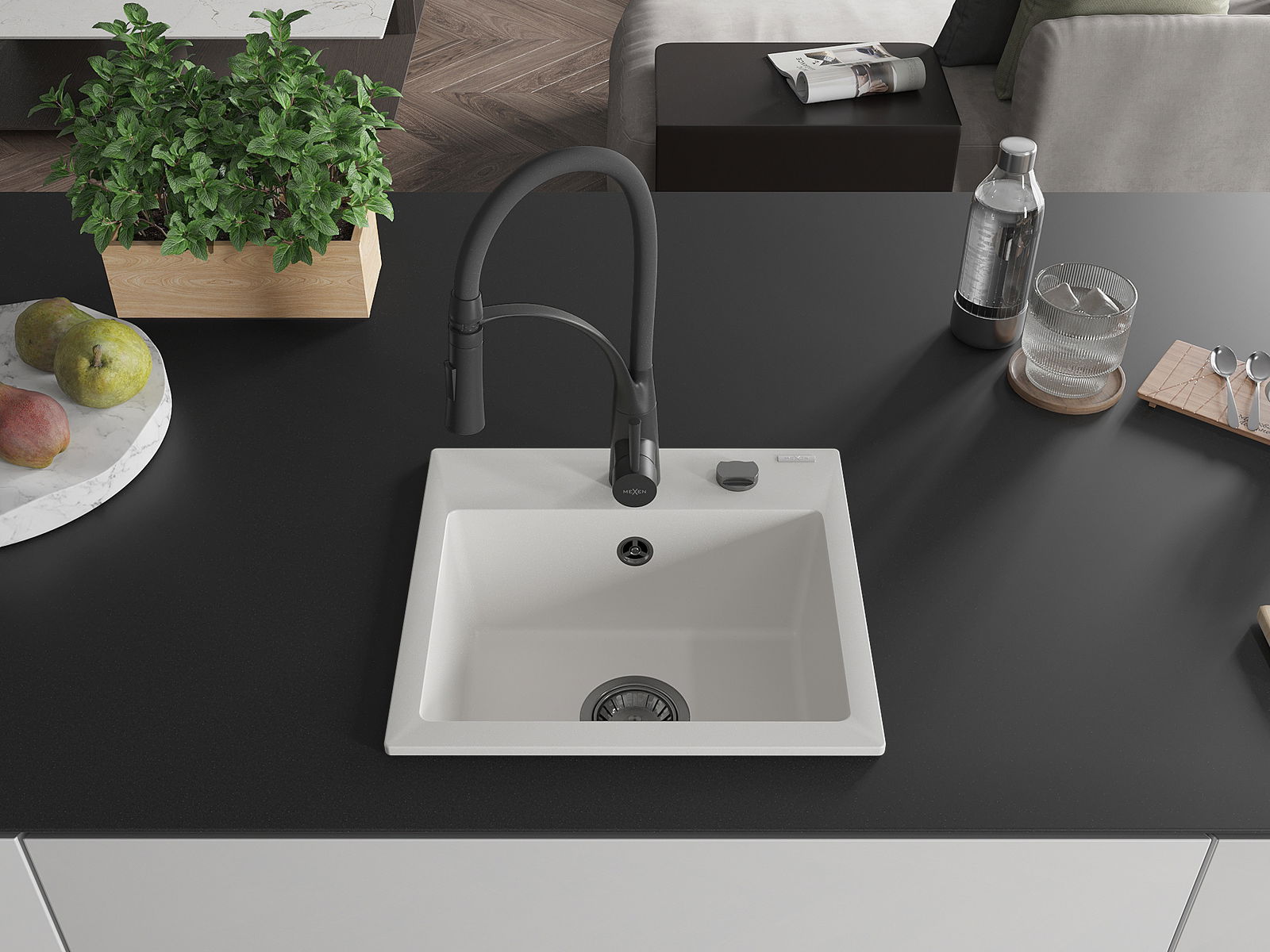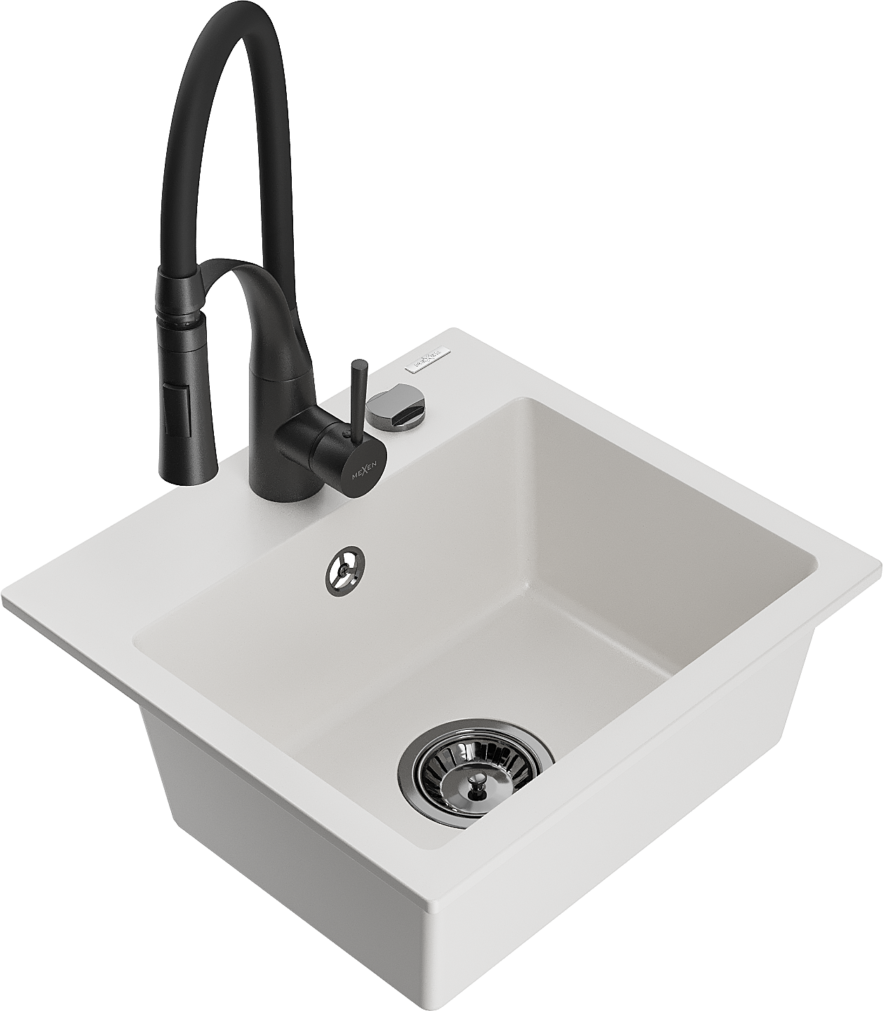Mexen Milo évier en granit 1 bac avec robinet de cuisine Aster, blanc - 6505-20-73450-70-B