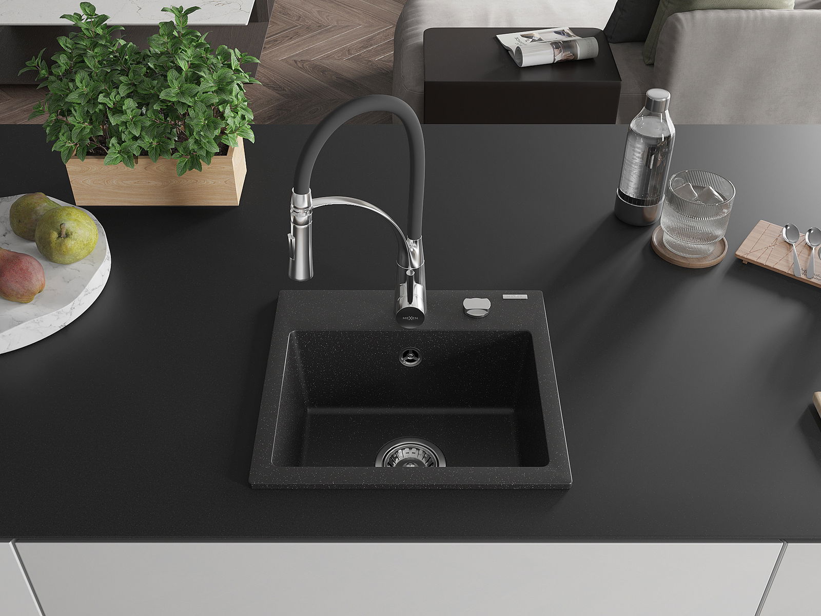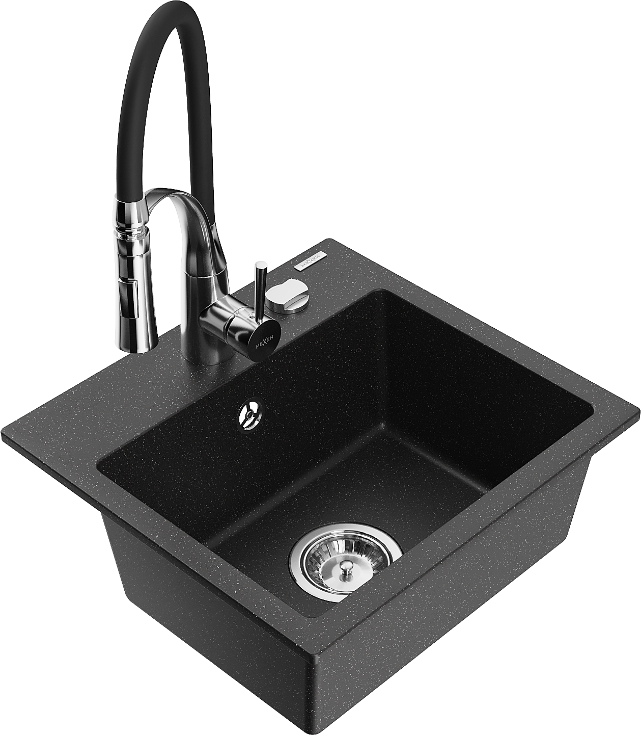 Mexen Milo évier de cuisine en granit 1 bac avec robinet de cuisine Aster, noir/argent métallique - 6505-73-73450-07