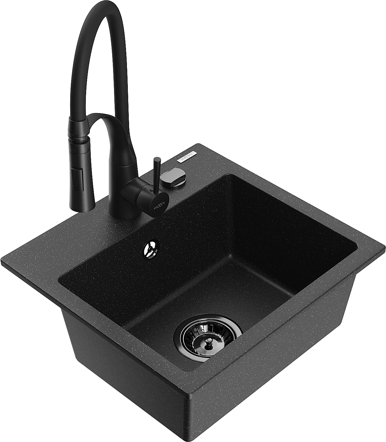 Mexen Milo évier en granit 1 bac avec robinet de cuisine Aster, noir/argent métallisé - 6505-73-73450-70-B