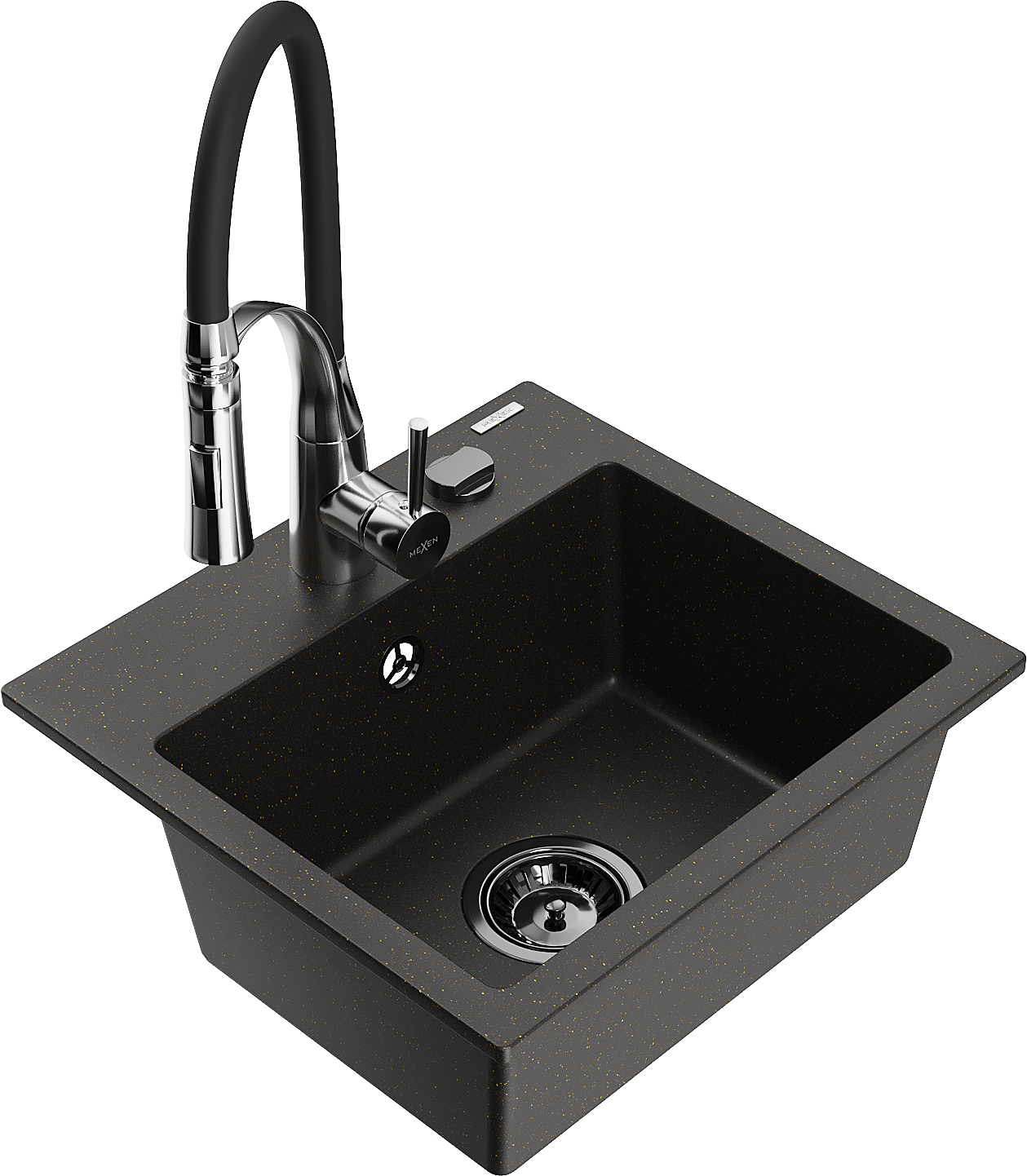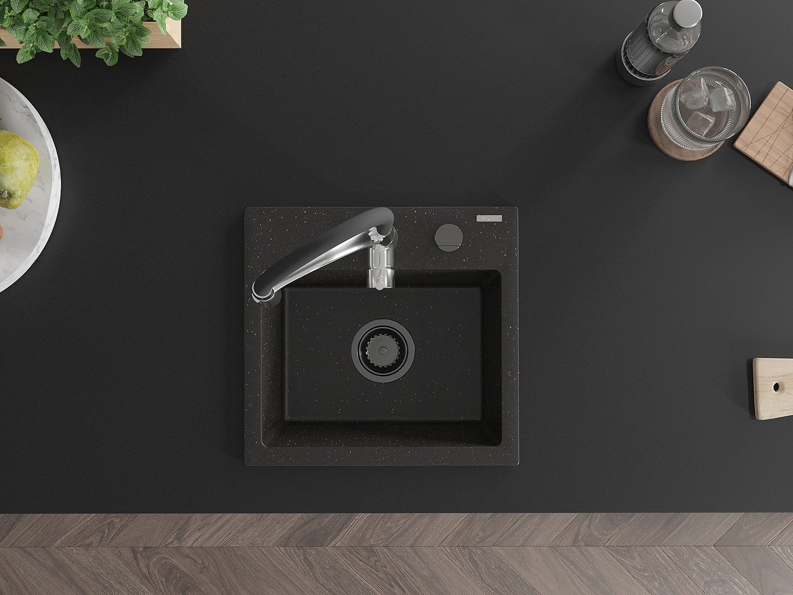 Mexen Milo évier en granit 1 bac avec robinet de cuisine Aster, noir/or métallisé - 6505-75-73450-07-B