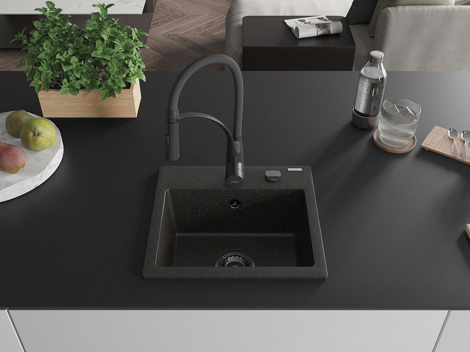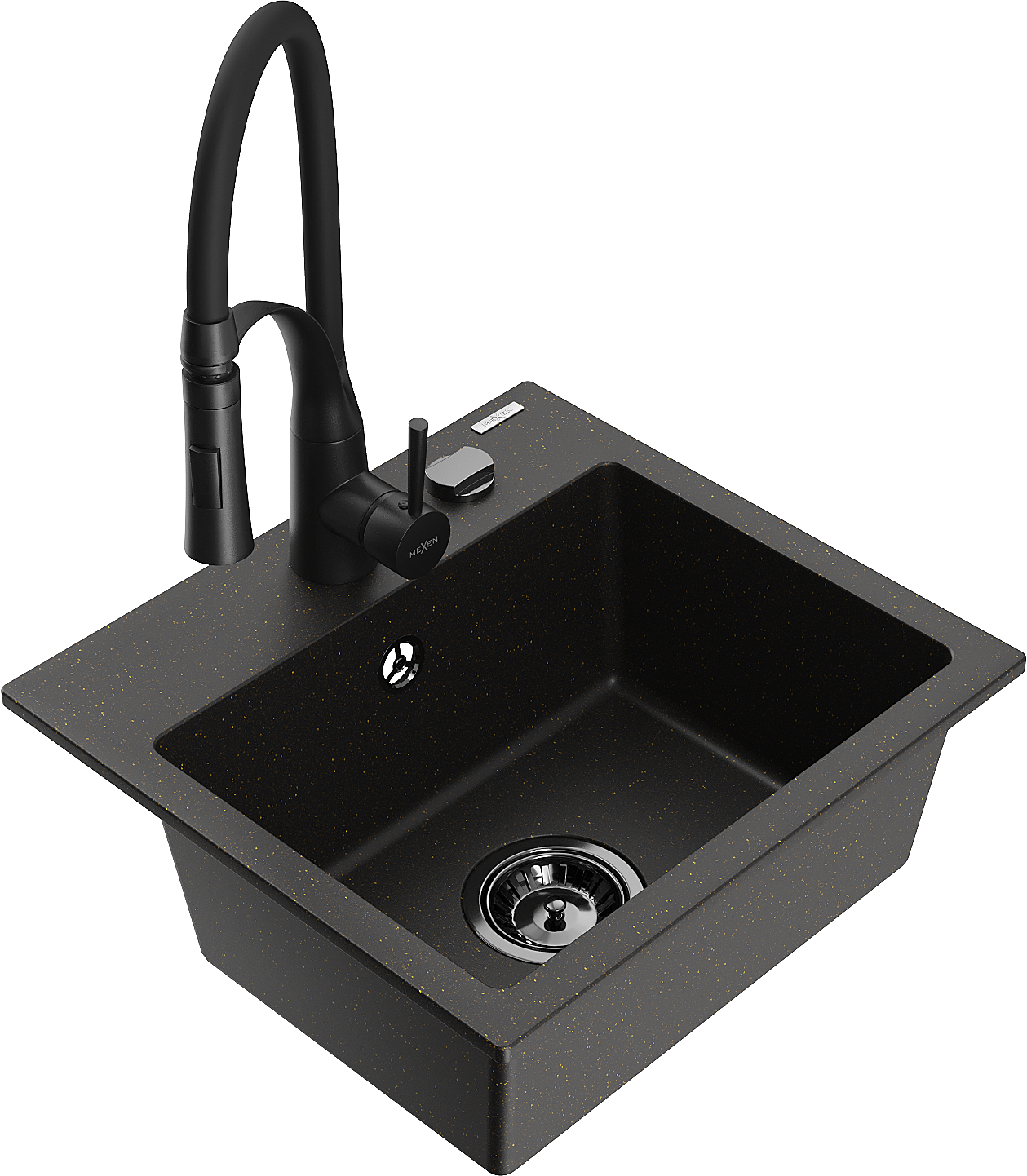 Mexen Milo évier en granit 1 bac avec robinet de cuisine Aster, noir/or métallique - 6505-75-73450-70-B