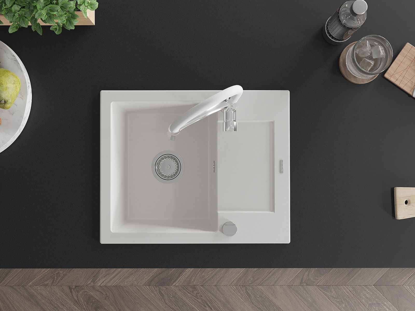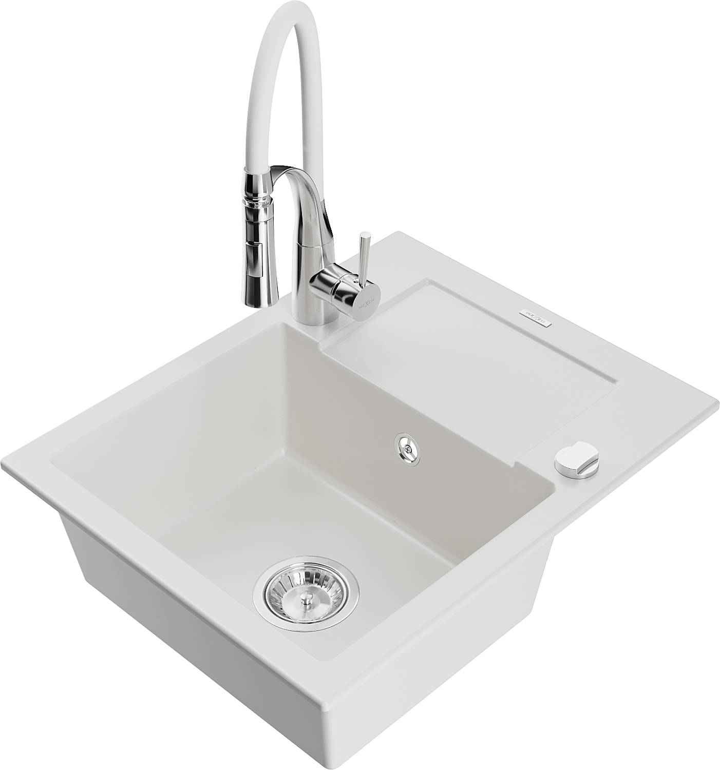 Mexen Enzo évier en granit 1 bac avec égouttoir et mitigeur de cuisine Aster, blanc - 6506-20-73450-02