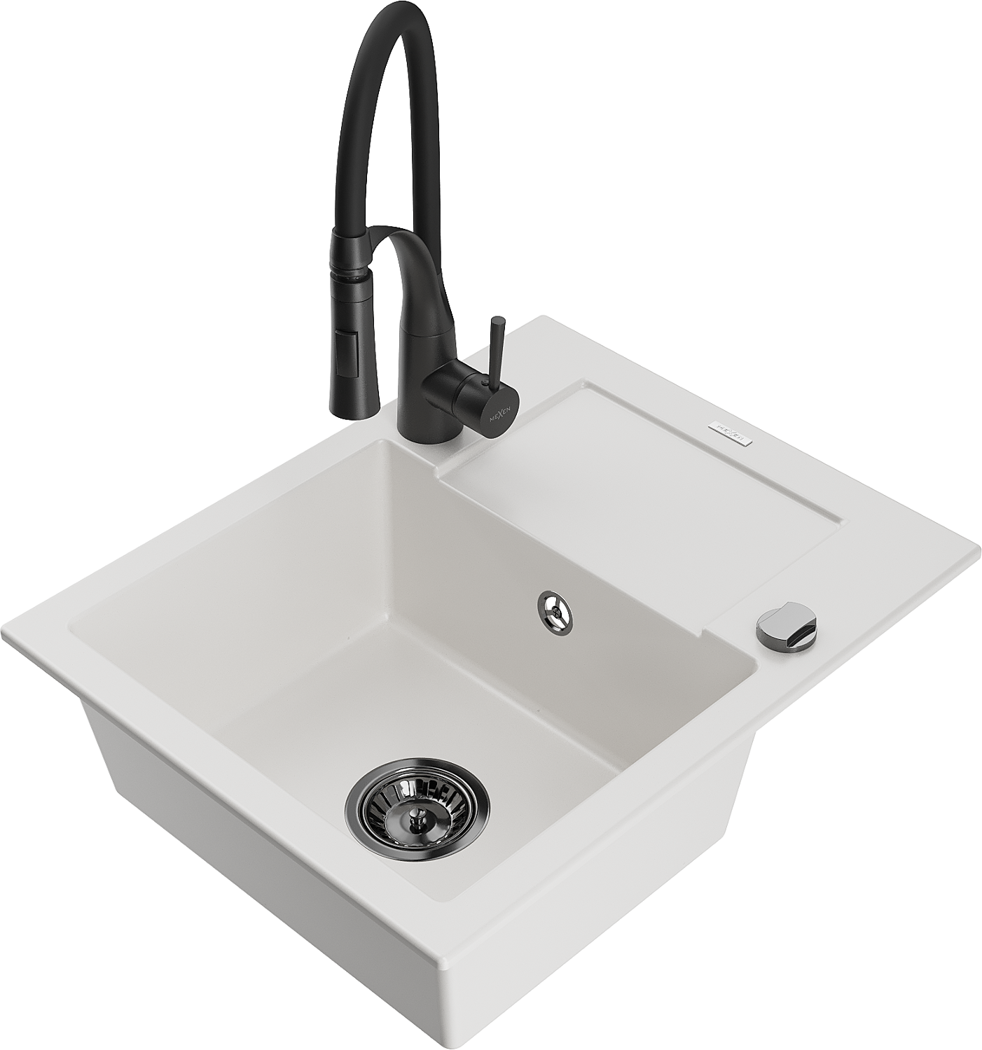 Mexen Enzo évier en granit 1 bac avec égouttoir et mitigeur de cuisine Aster, blanc - 6506-20-73450-70-B