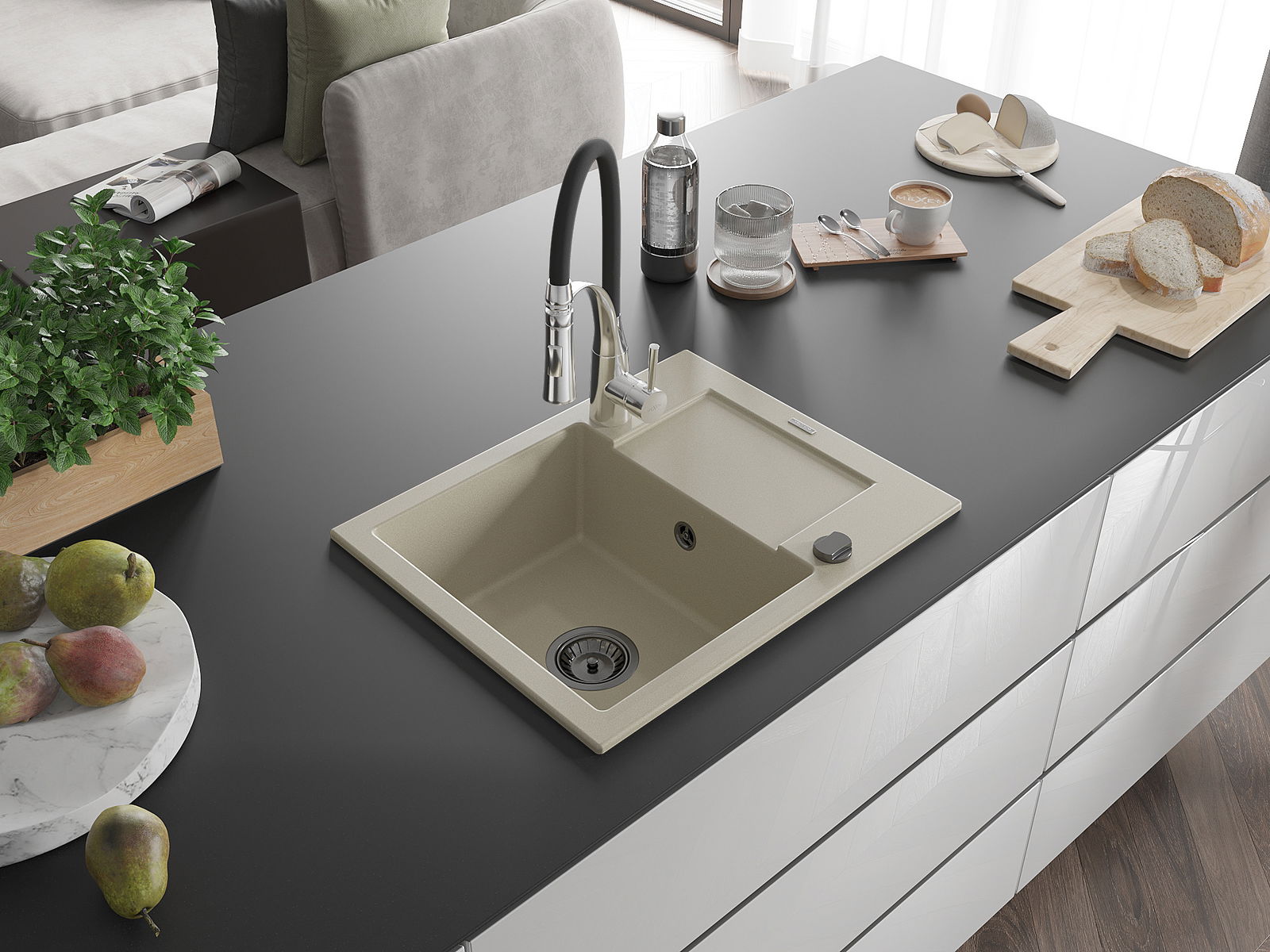 Mexen Enzo évier en granit 1 bac avec égouttoir et robinet de cuisine Aster, beige - 6506-69-73450-07-B