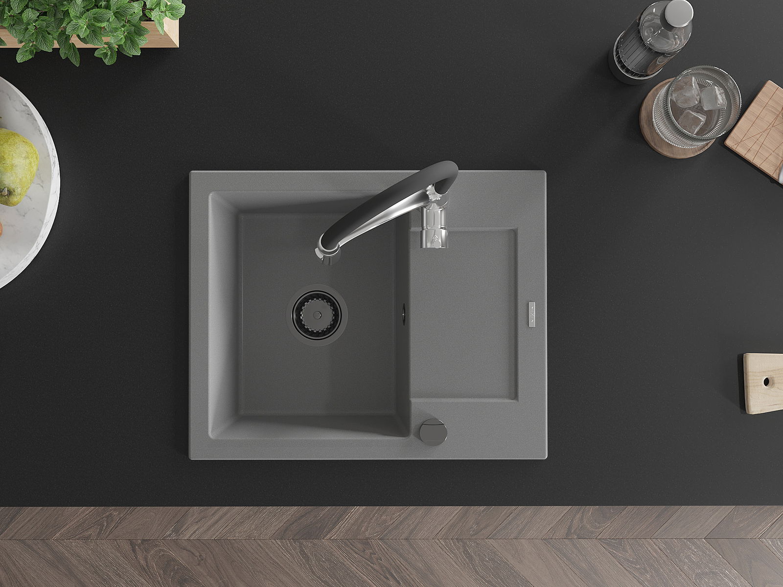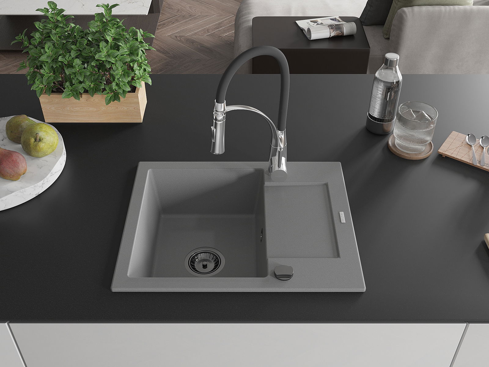 Mexen Enzo évier en granit 1 bac avec égouttoir et mitigeur de cuisine Aster, gris - 6506-71-73450-07-B