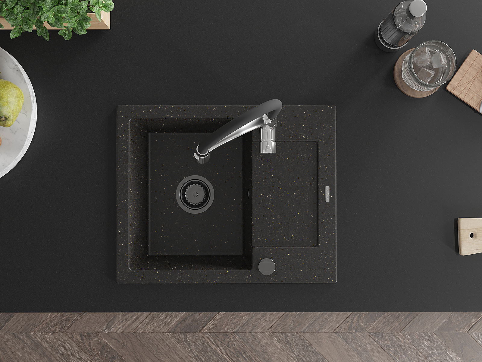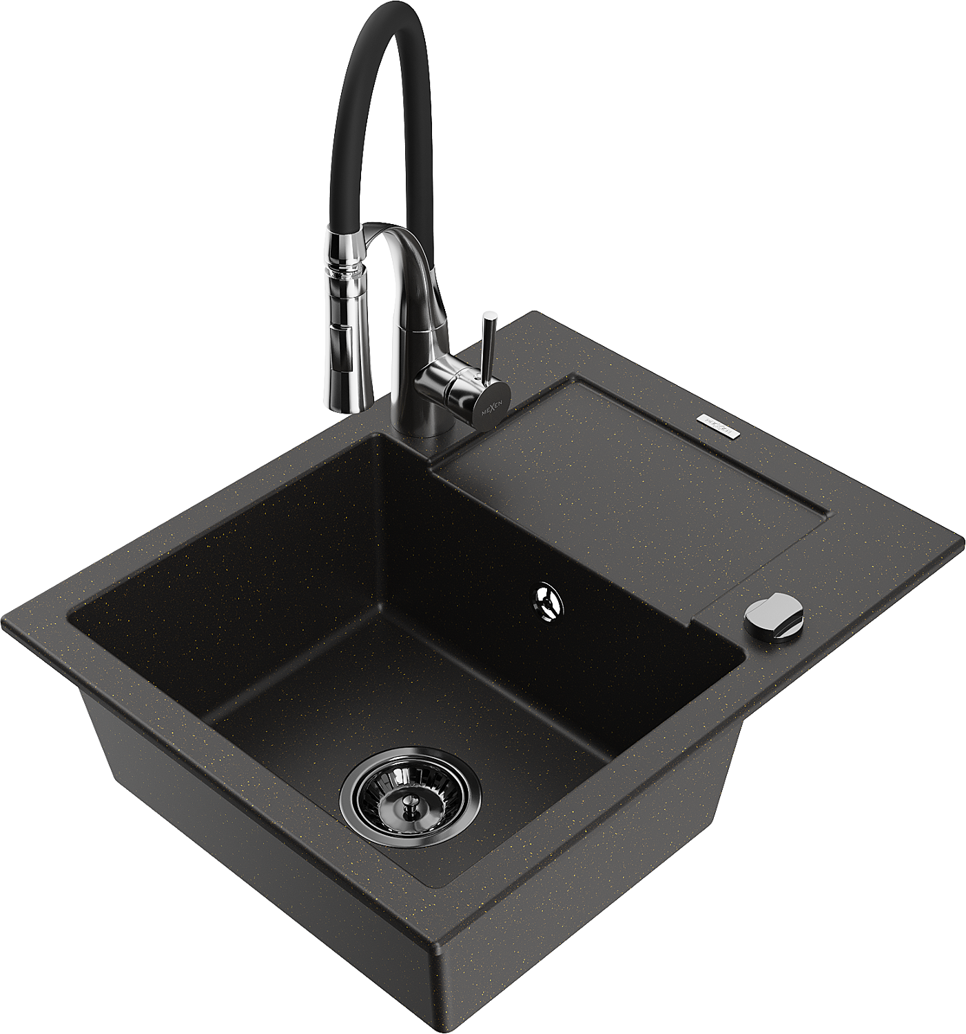 Mexen Enzo évier en granit à 1 cuve avec égouttoir et robinet de cuisine Aster, noir/doré métallisé - 6506-75-73450-07-B