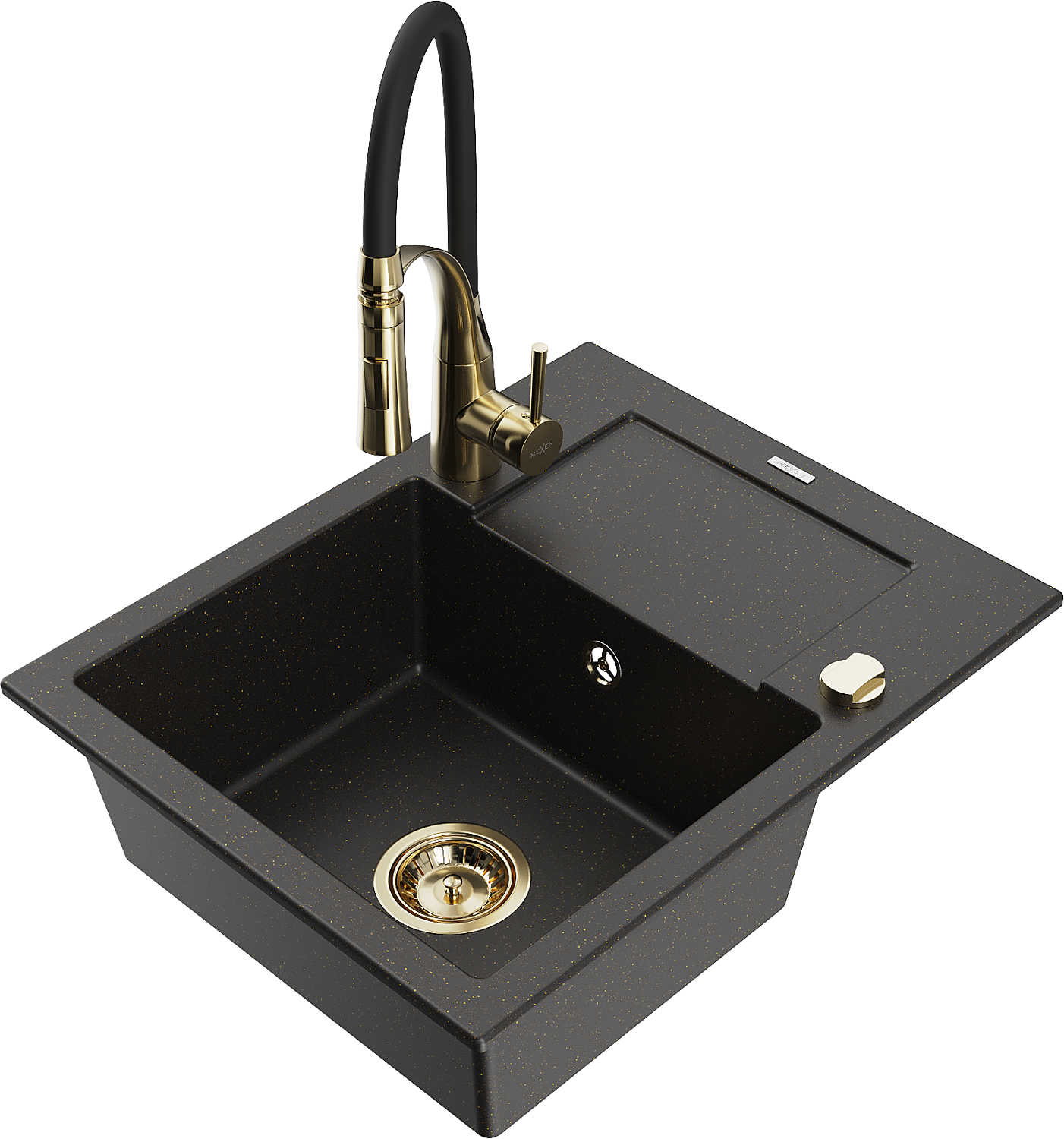 Mexen Enzo évier en granit à 1 bac avec égouttoir et robinet de cuisine Aster, noir/métallisé doré - 6506-75-73450-57-G