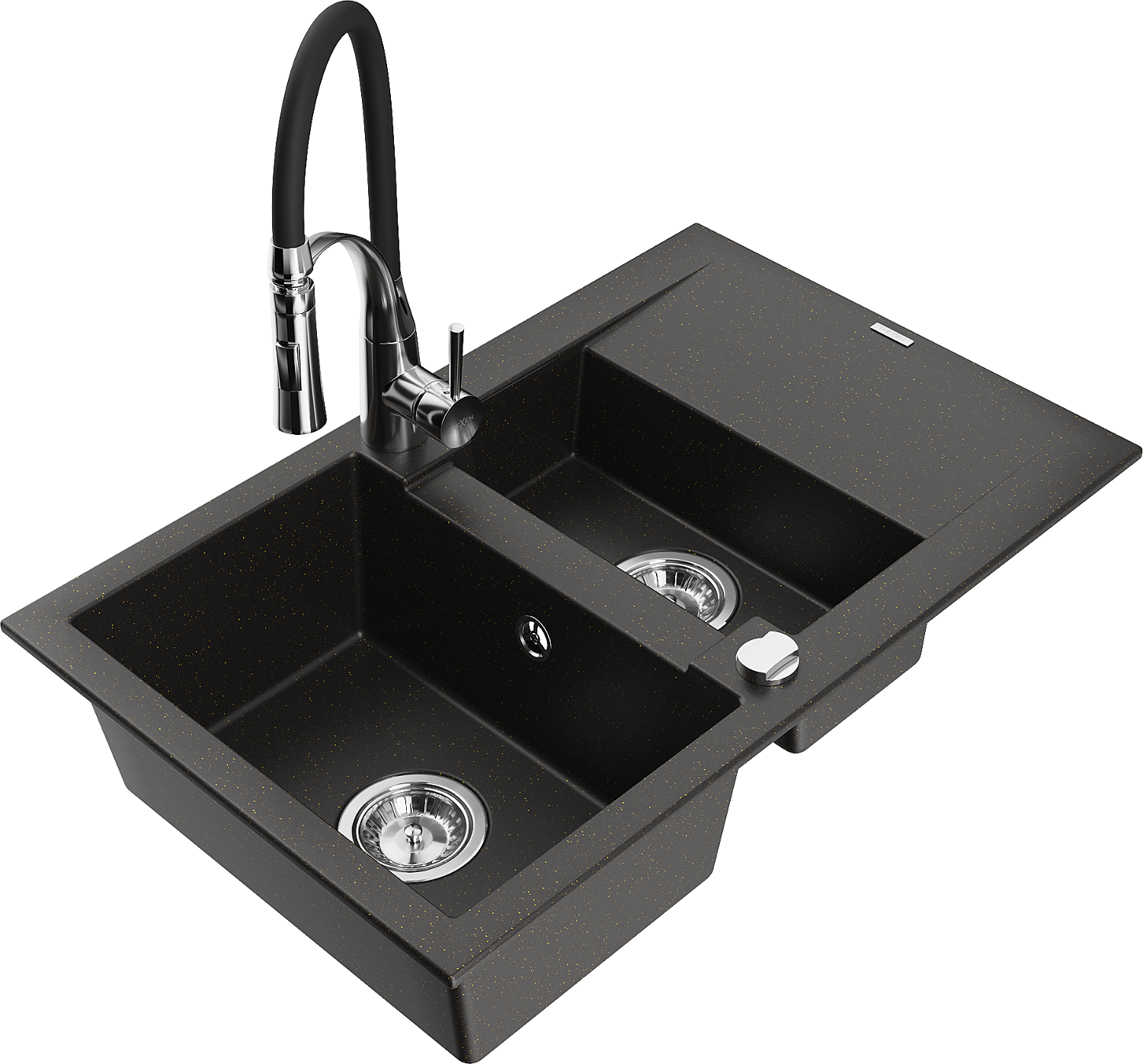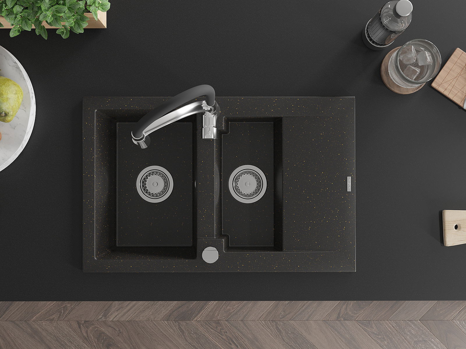 Mexen Gaspar évier en granit 1,5 bac avec égouttoir et mitigeur cuisine Aster, noir/or métallisé - 6507-75-73450-07
