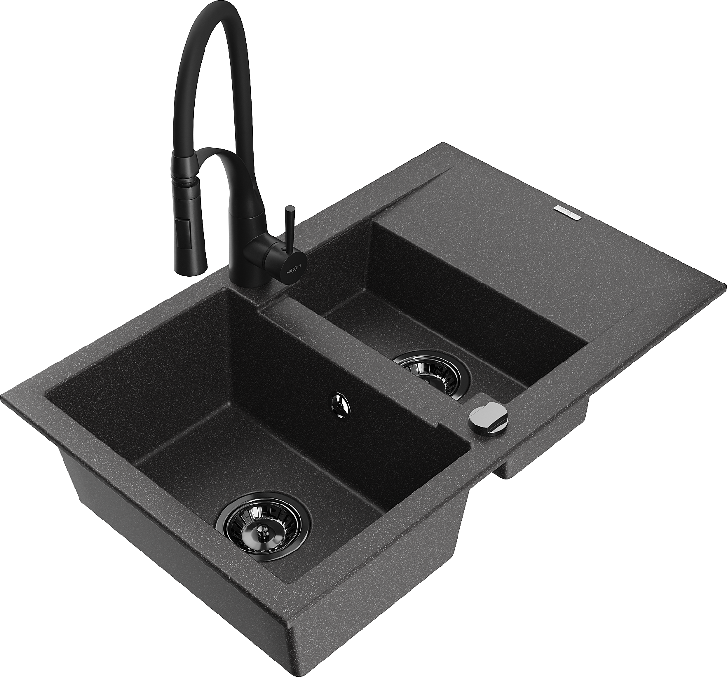 Mexen Gaspar évier en granit 1,5 bac avec égouttoir et robinet de cuisine Aster, noir moucheté - 6507-76-73450-70-B