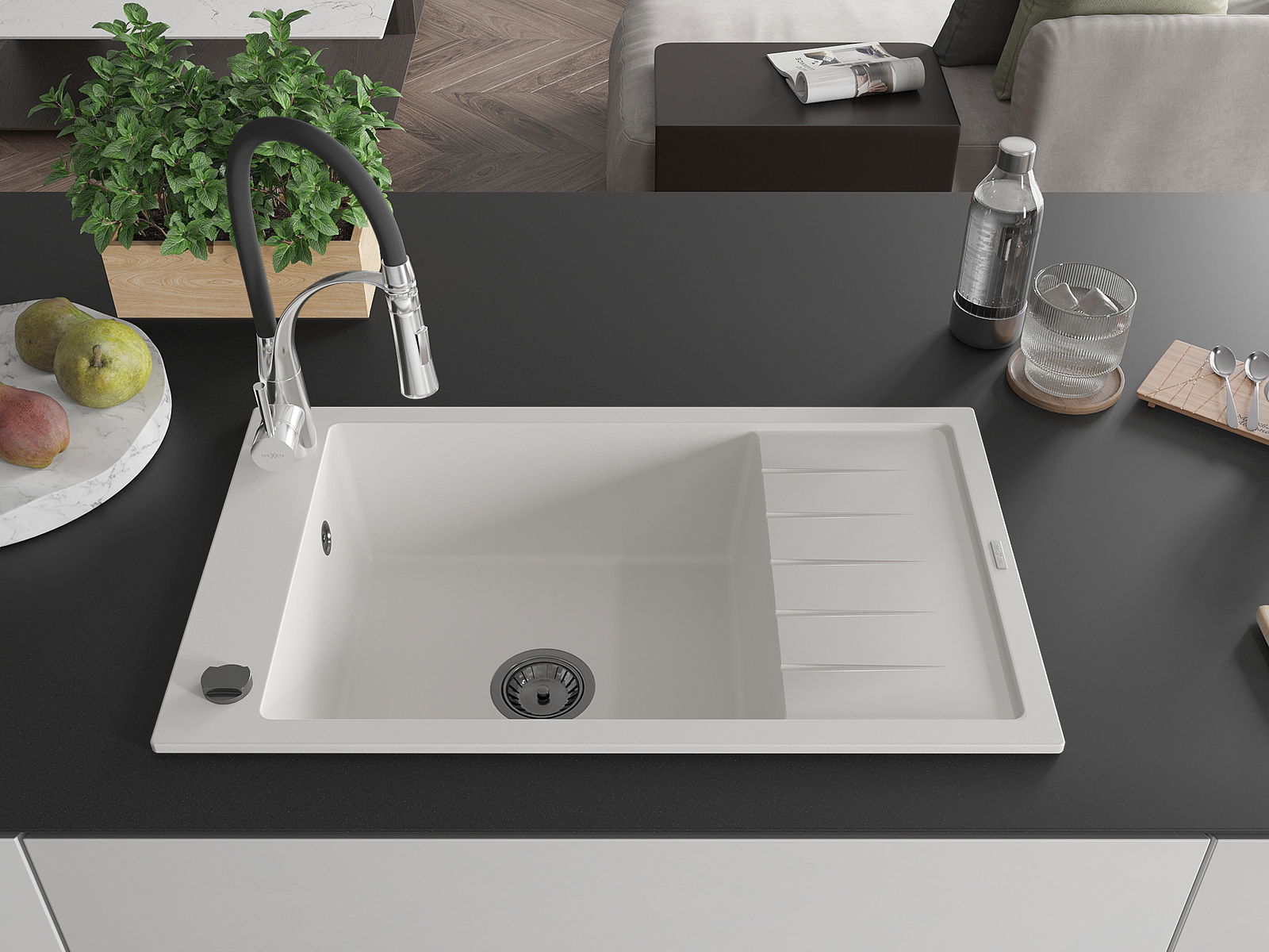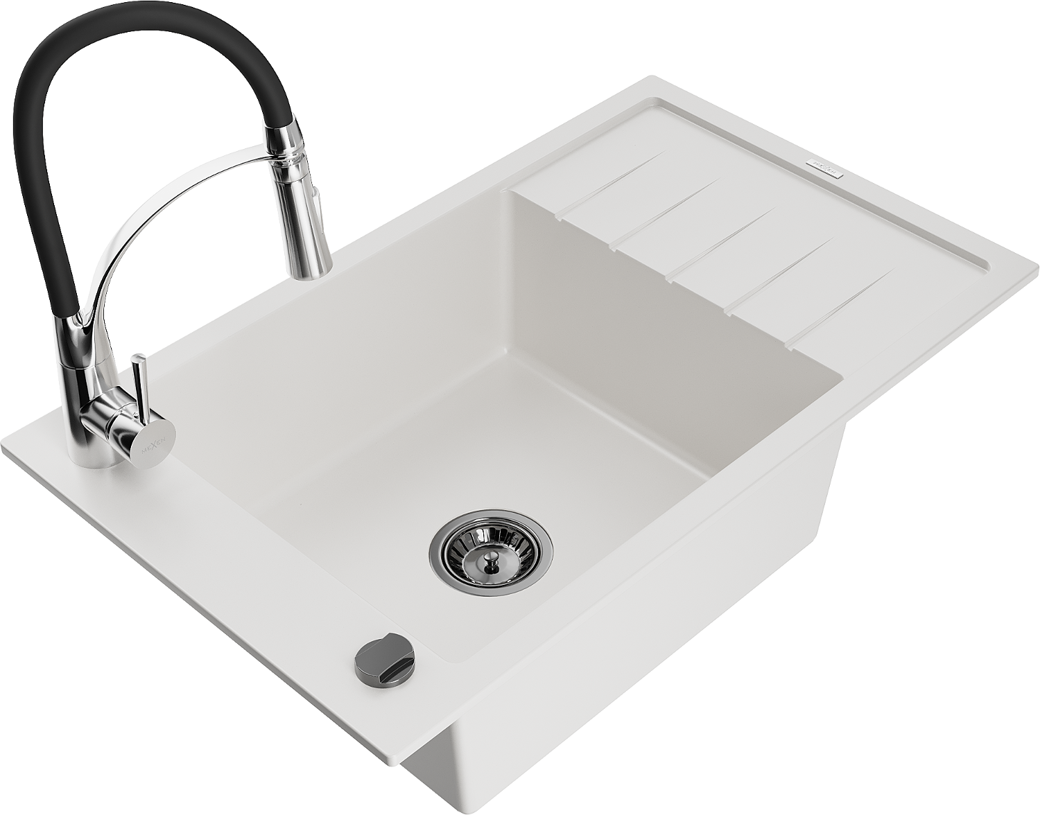 Mexen Elias évier en granit 1 bac avec égouttoir et mitigeur de cuisine Aster, blanc - 6511-20-73450-07-B
