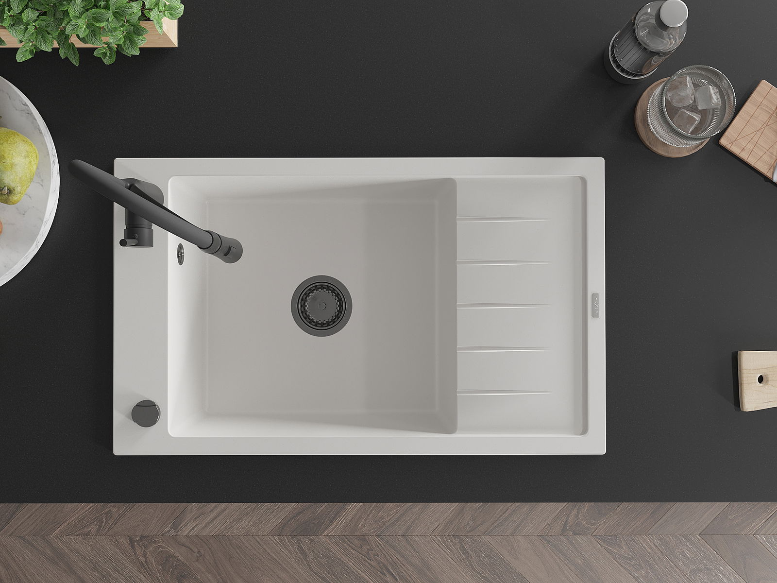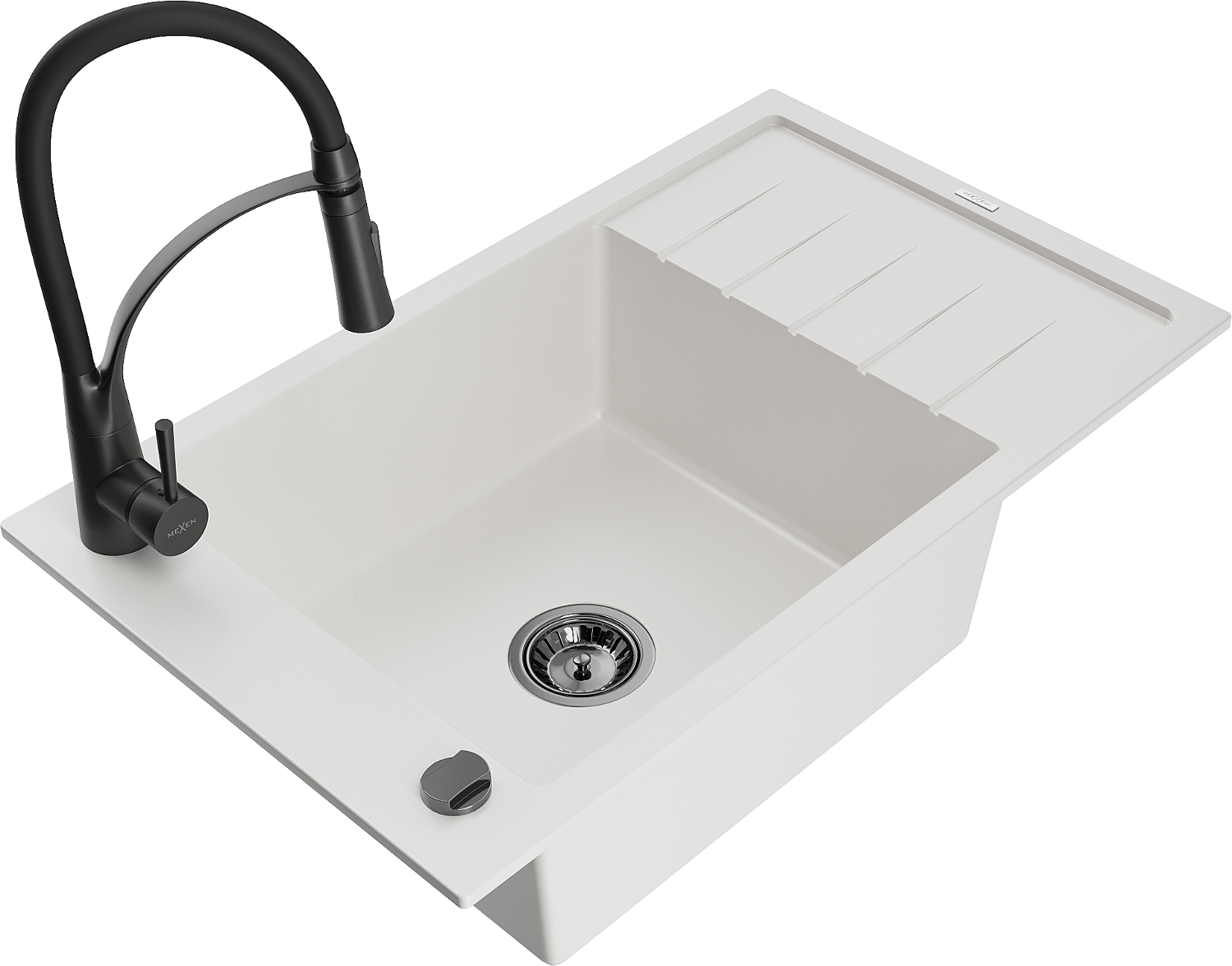 Mexen Elias évier en granit 1 bac avec égouttoir et mitigeur de cuisine Aster, blanc - 6511-20-73450-70-B