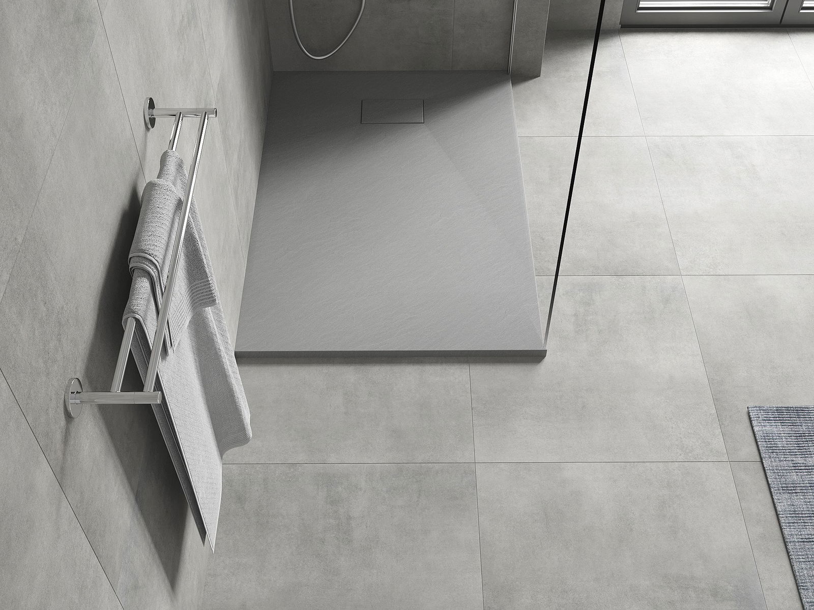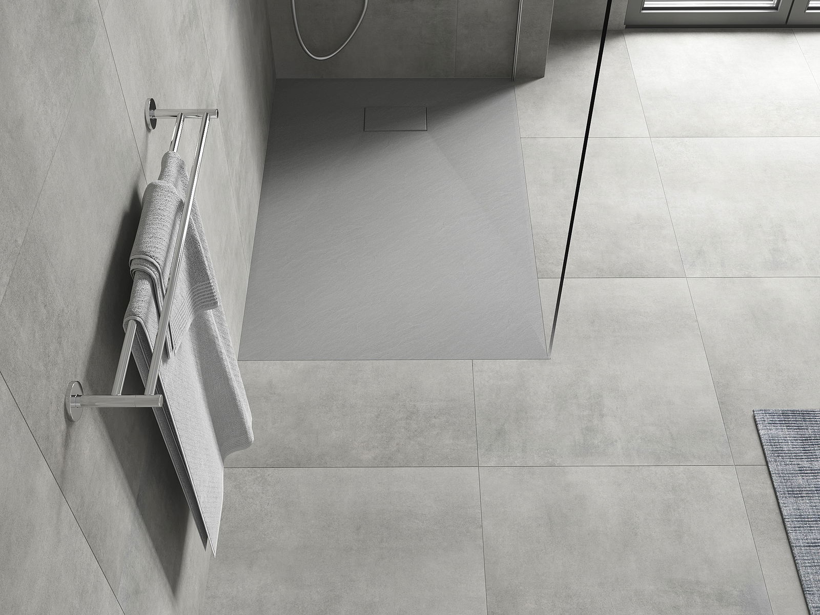 La surface du receveur de douche évoque la pierre. C'est une combinaison unique d'aspect naturel et de design intérieur moderne. Il ajoute du caractère, souligne l'esthétique et l'élégance de la salle de bains et séduit par sa forme.