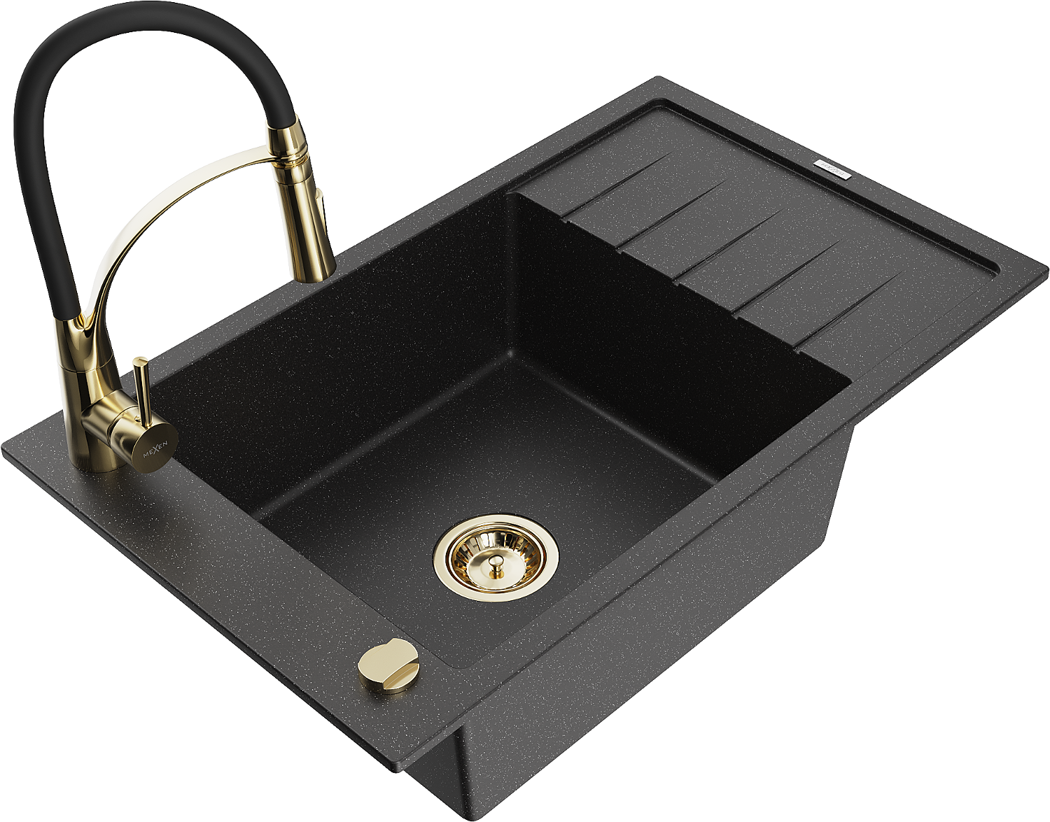 Mexen Elias évier de cuisine en granit 1 bac avec égouttoir et mitigeur Aster, noir/métallique argenté - 6511-73-73450-57-G