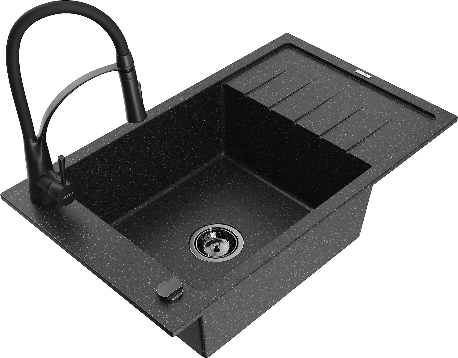Mexen Elias évier de cuisine en granit 1 bac avec égouttoir et robinet de cuisine Aster, noir/argent métallisé - 6511-73-73450-?