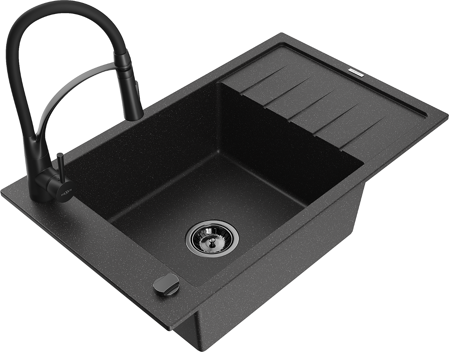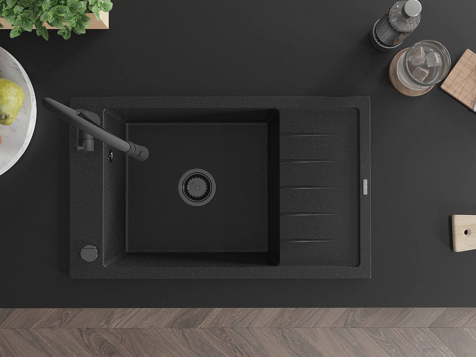 Mexen Elias évier en granit à 1 bac avec égouttoir et robinet de cuisine Aster, noir/métallisé argenté