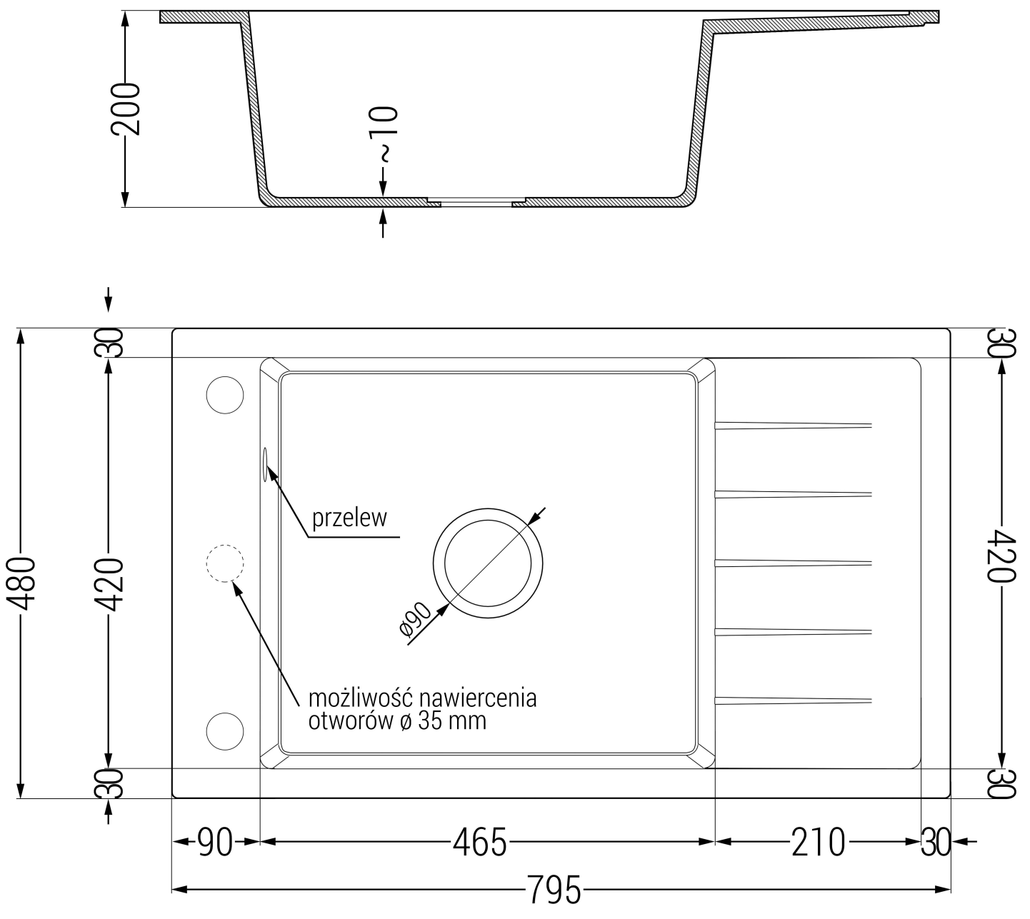 L'évier a un trou sous-meulé de 35 mm de diamètre à percer soi-même. Il peut être utilisé, entre autres, pour installer un distributeur de liquide, ce qui éliminera la présence de bouteilles en plastique dans la cuisine et lui donnera une finition élégante.