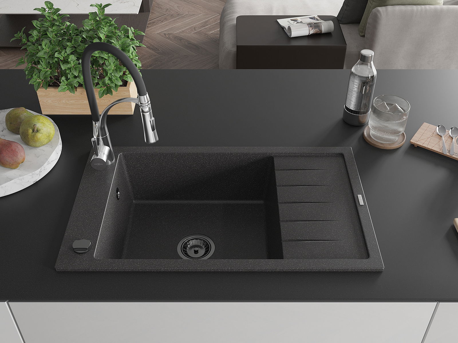Mexen Elias évier en granit 1 bac avec égouttoir et robinet de cuisine Aster, noir moucheté - 6511-76-73450-07-B