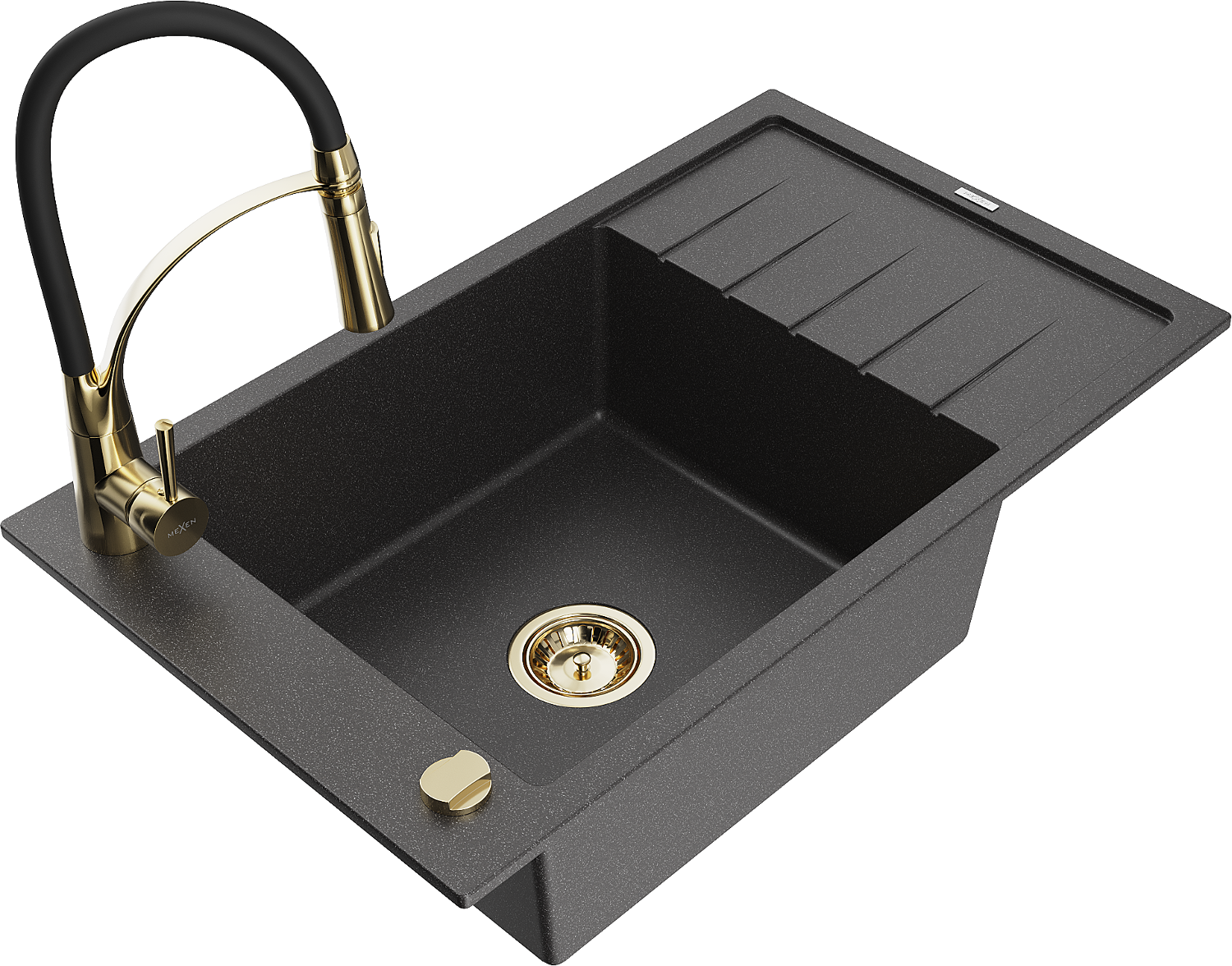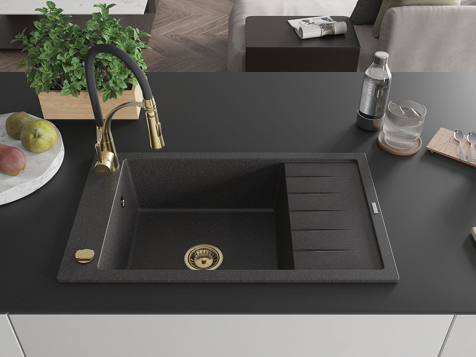 Mexen Elias évier de cuisine en granit 1 bac avec égouttoir et robinet de cuisine Aster, noir moucheté - 6511-76-73450-57-G