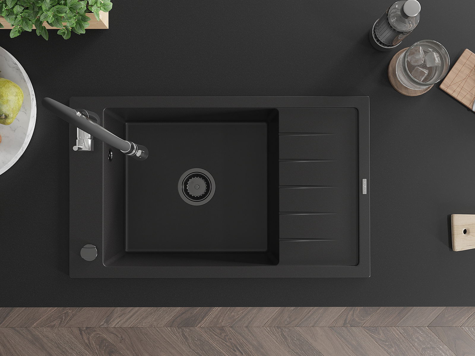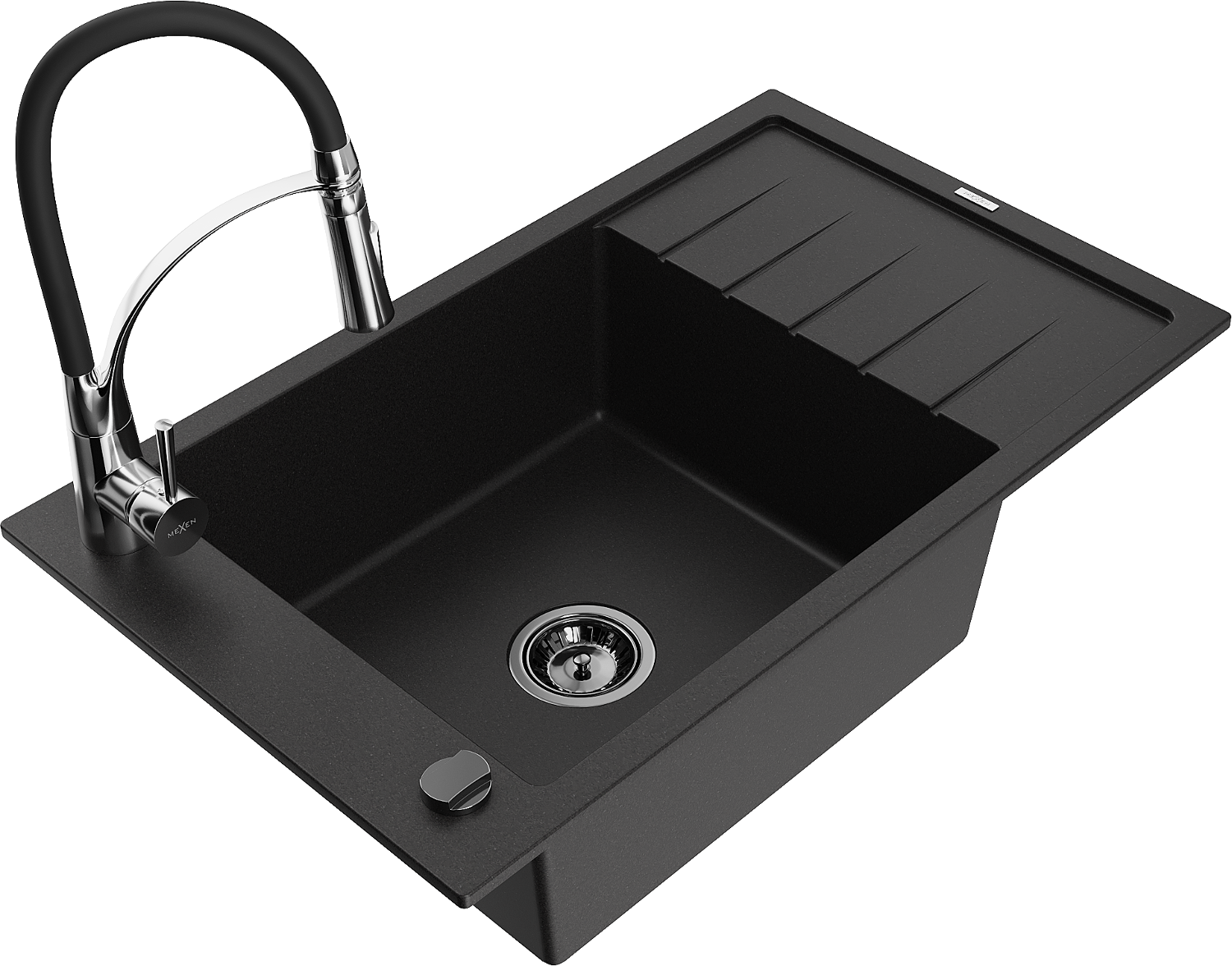 Mexen Elias évier de cuisine en granit 1 bac avec égouttoir et robinet de cuisine Aster, noir - 6511-77-73450-07-B
