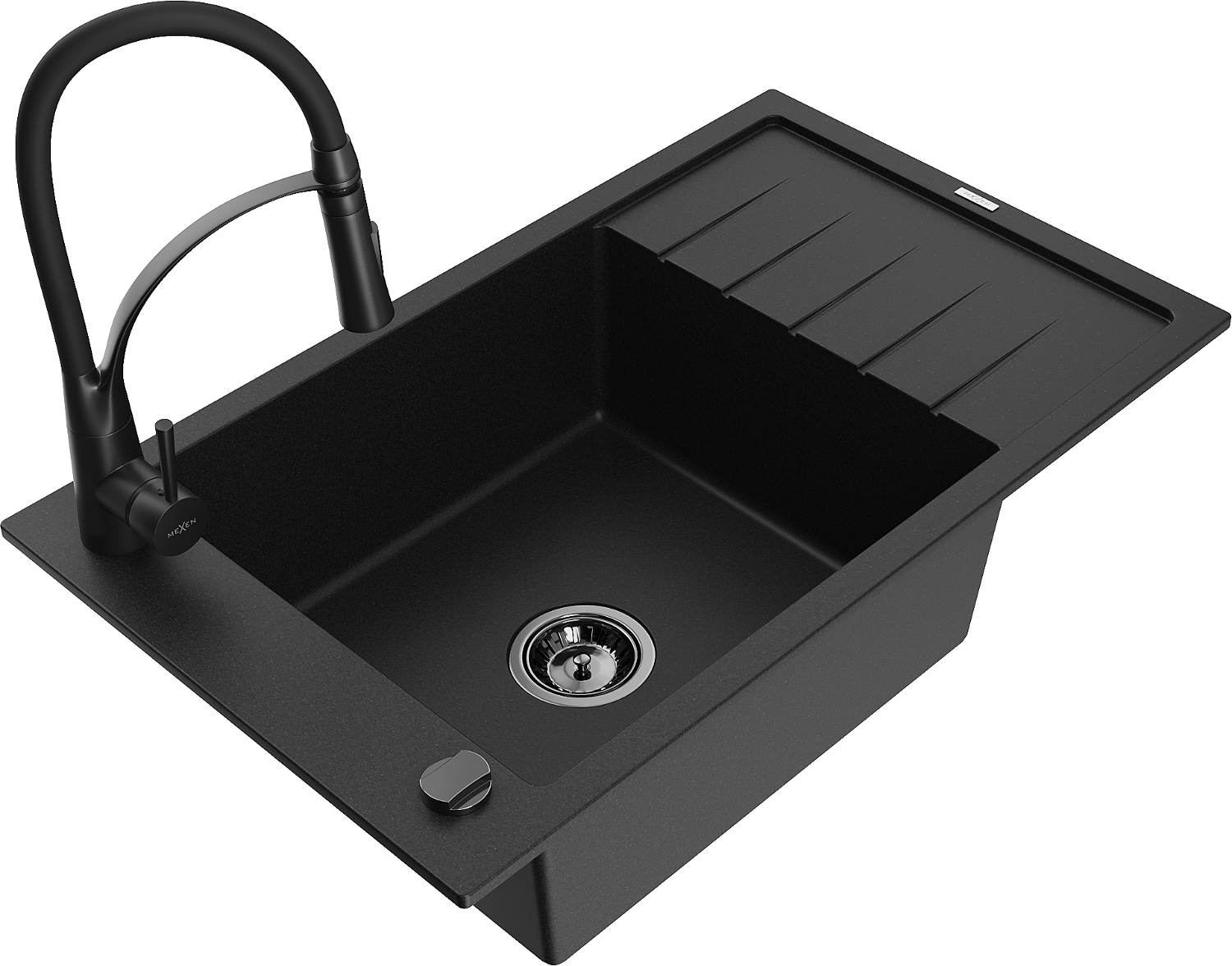 Mexen Elias évier de cuisine en granit 1 bac avec égouttoir et robinet de cuisine Aster, noir - 6511-77-73450-70-B