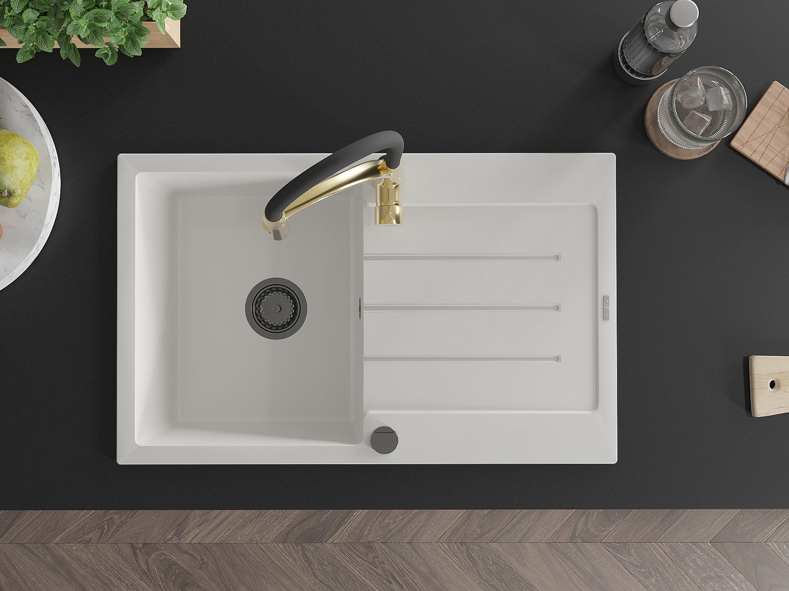 Mexen Bruno évier en granit 1 bac avec égouttoir et robinet de cuisine Aster, blanc - 6513-20-73450-57-B