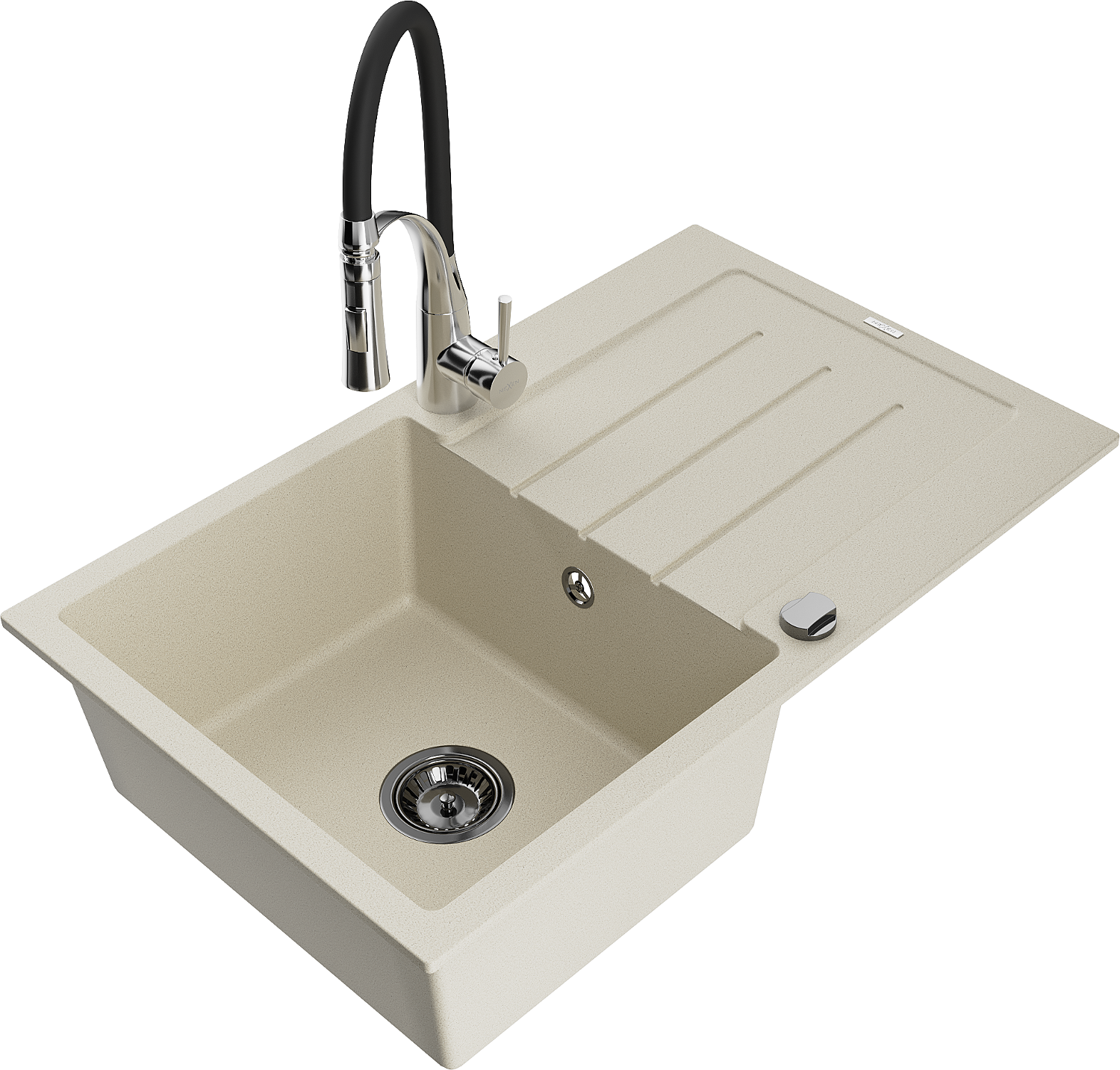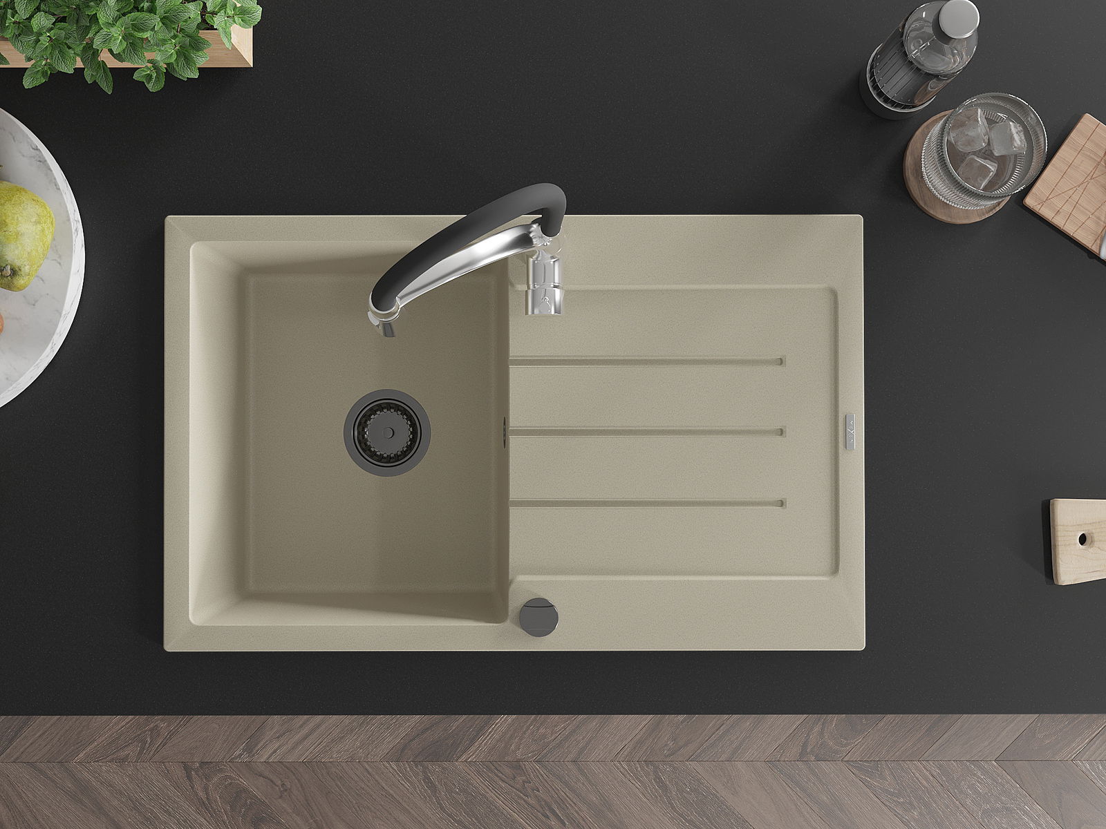 Mexen Bruno évier de cuisine en granit 1 bac avec égouttoir et robinet de cuisine Aster, beige - 6513-69-73450-07-B