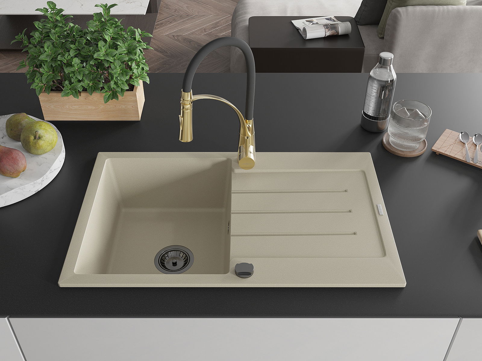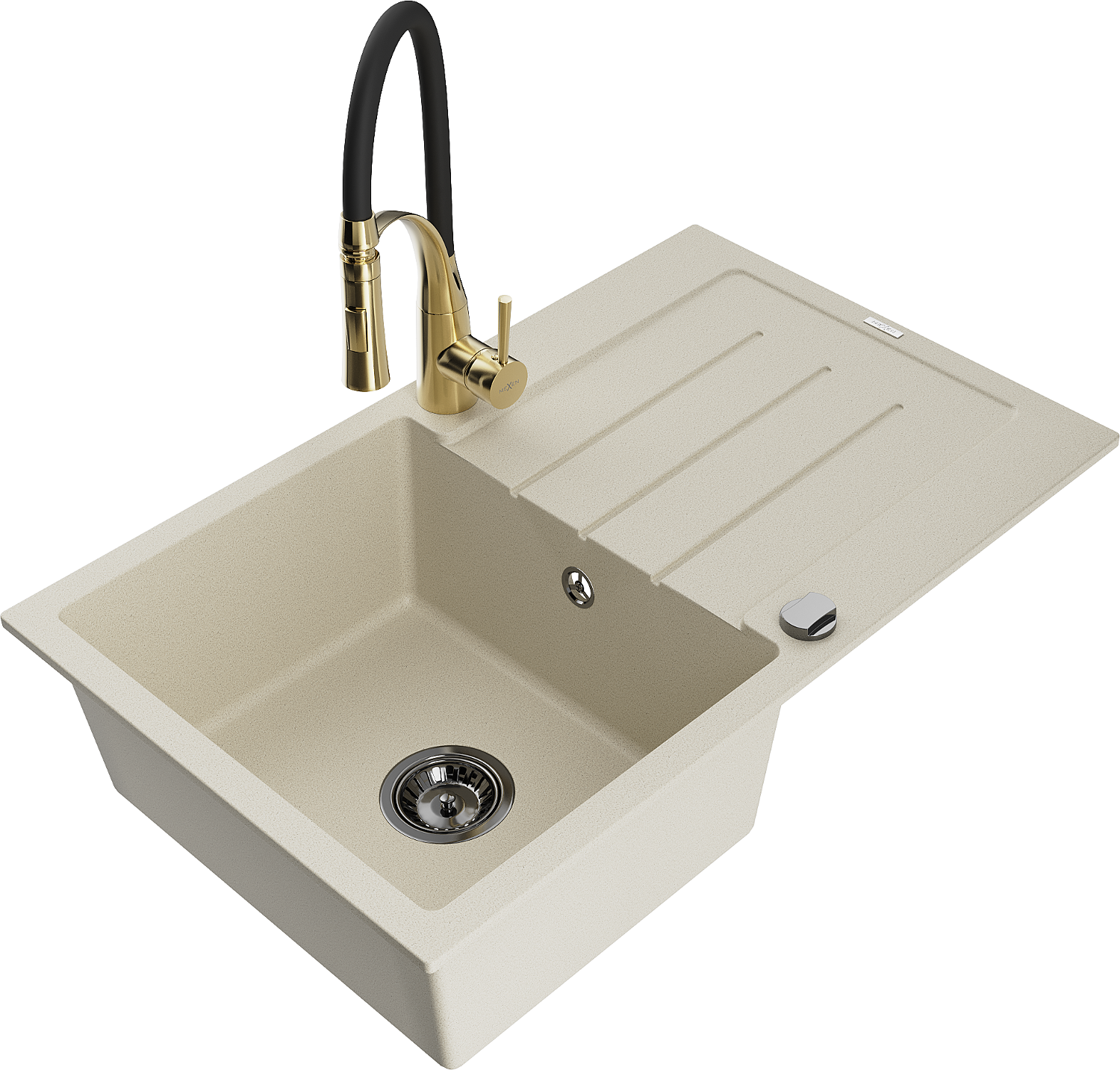 Mexen Bruno évier de cuisine en granit 1 bac avec égouttoir et robinet de cuisine Aster, beige - 6513-69-73450-57-B
