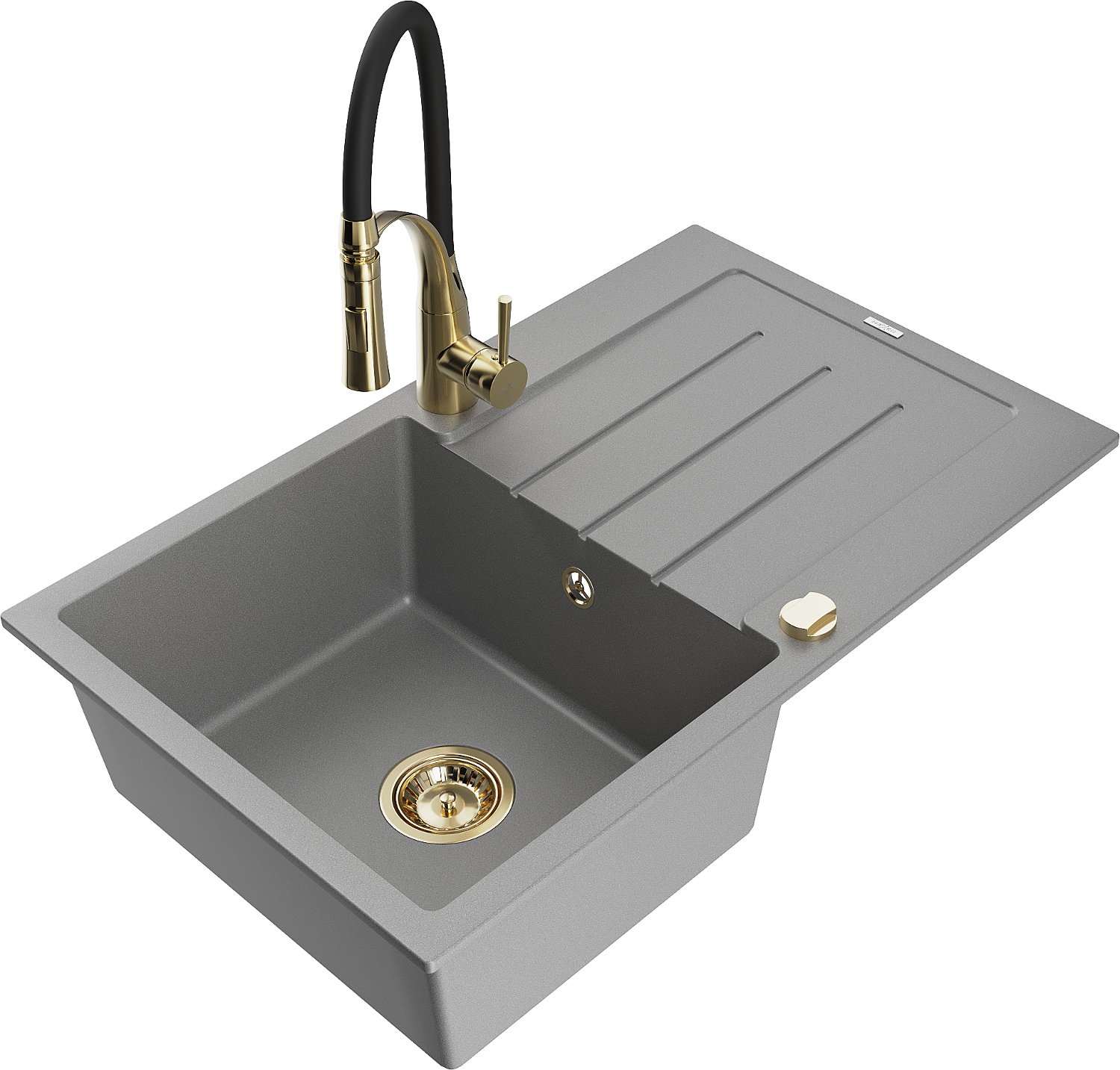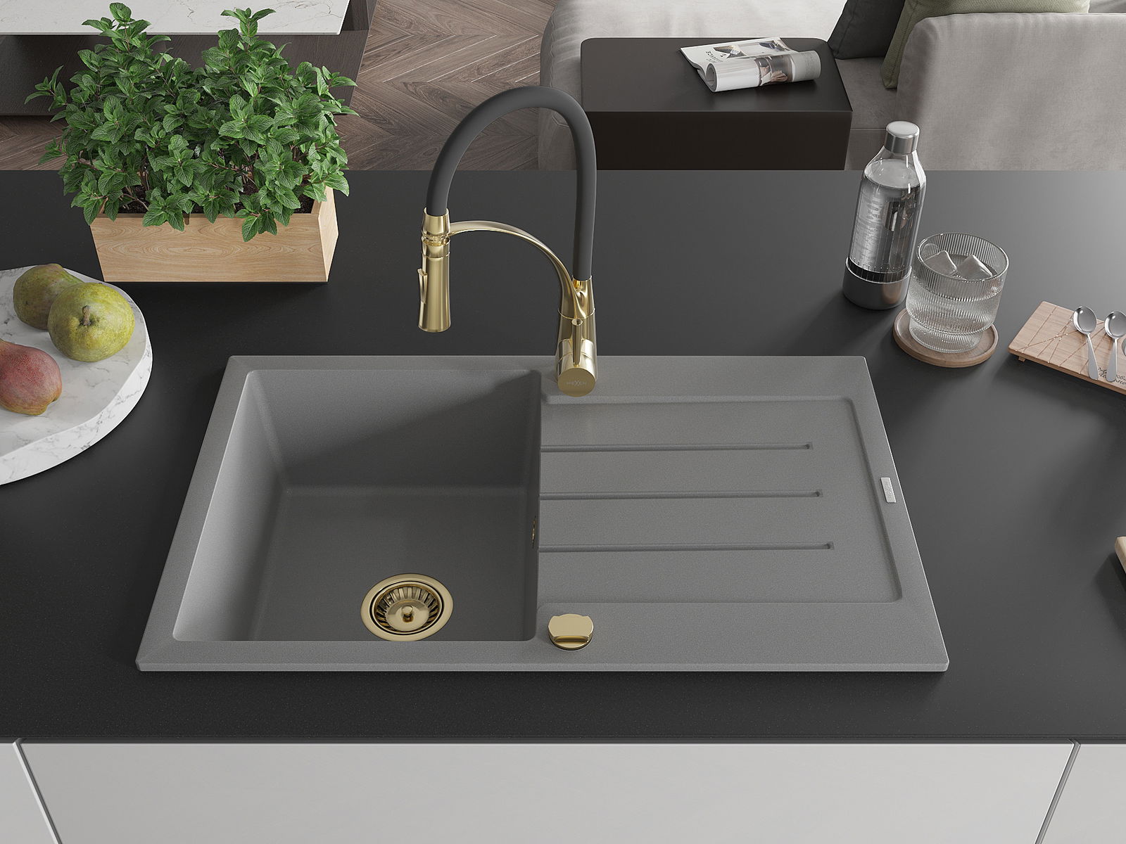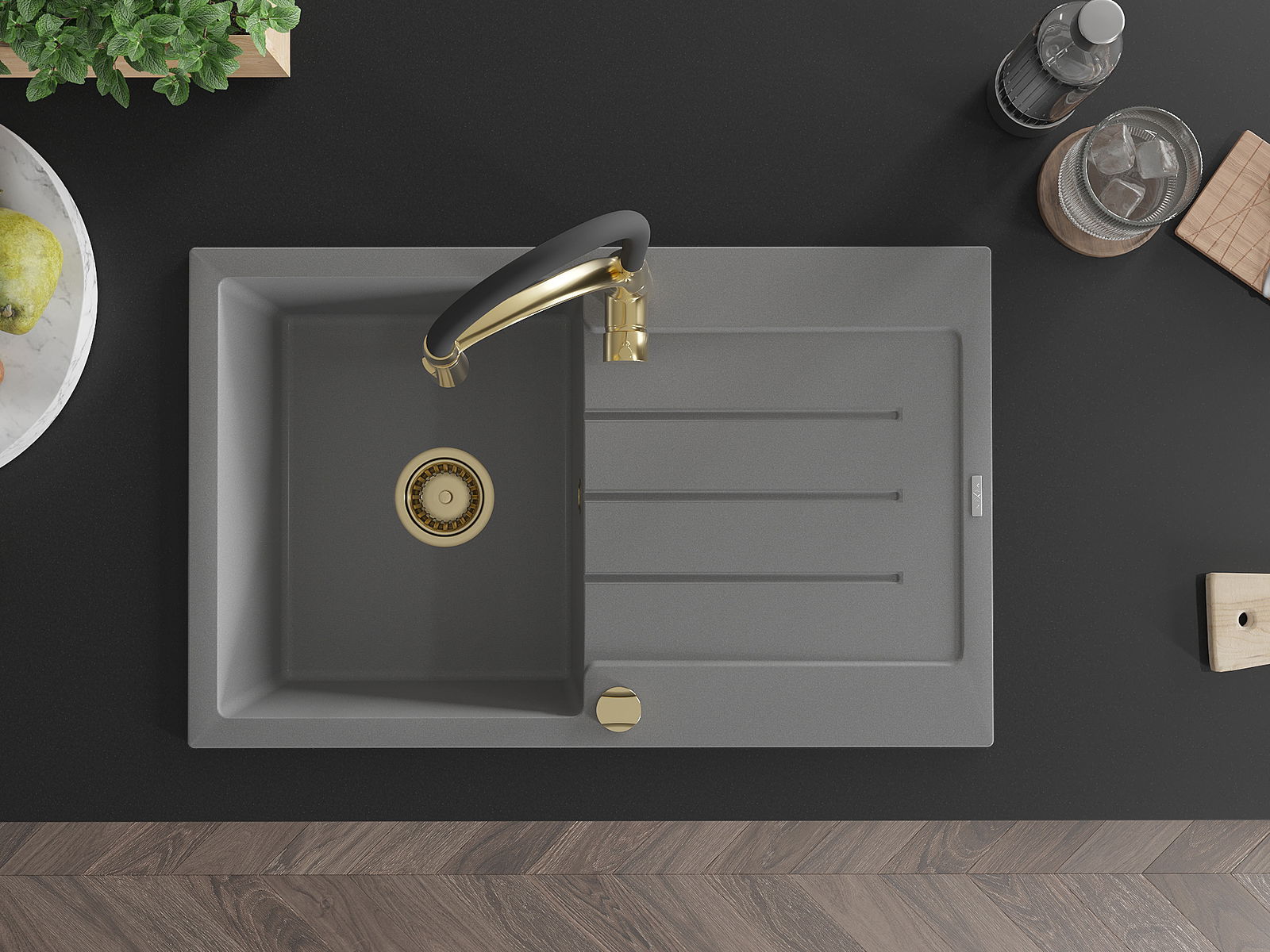Mexen Bruno évier en granit 1-bac avec égouttoir et robinet de cuisine Aster, gris - 6513-71-73450-57-G
