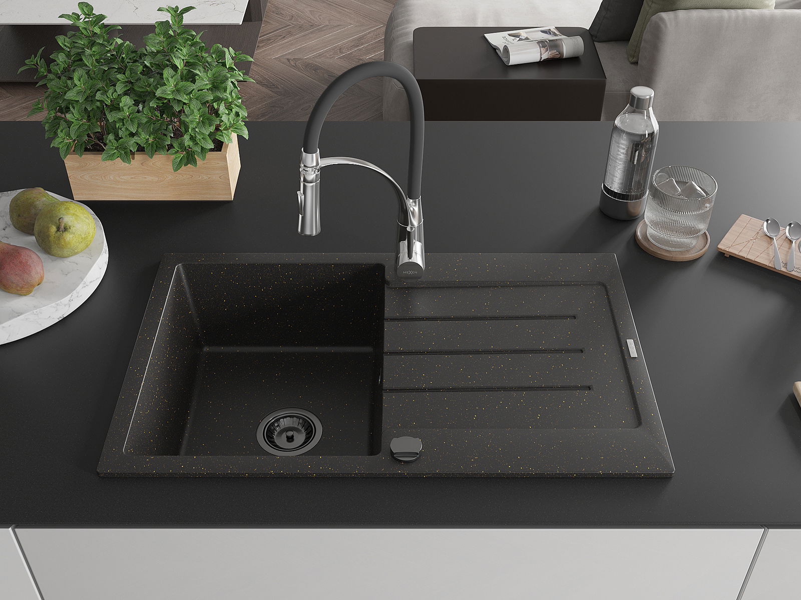 Mexen Bruno évier en granit 1 bac avec égouttoir et robinet de cuisine Aster, noir/or métallique - 6513-75-73450-07-B