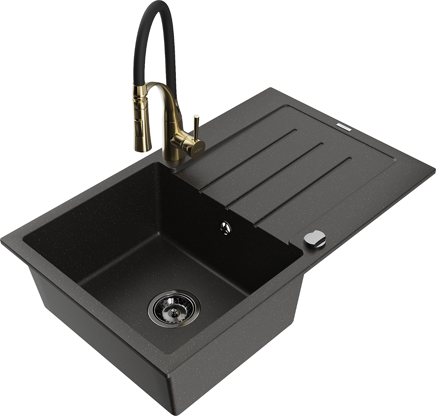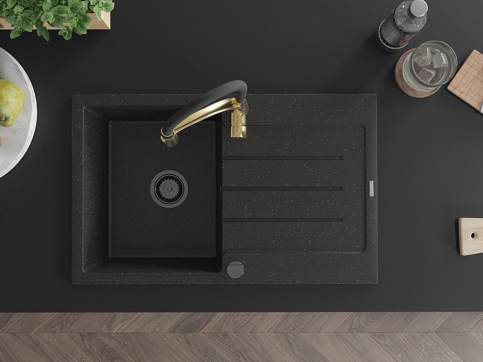 Mexen Bruno évier en granit 1 bac avec égouttoir et robinet de cuisine Aster, noir/or métallique - 6513-75-73450-57-B