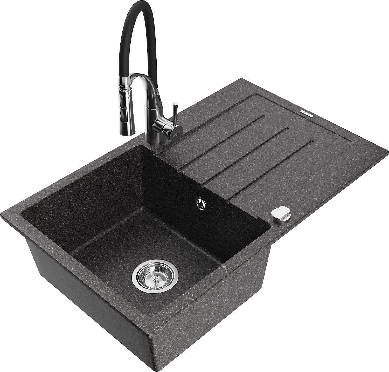 Mexen Bruno évier en granit 1 bac avec égouttoir et robinet de cuisine Aster, noir moucheté - 6513-76-73450-07