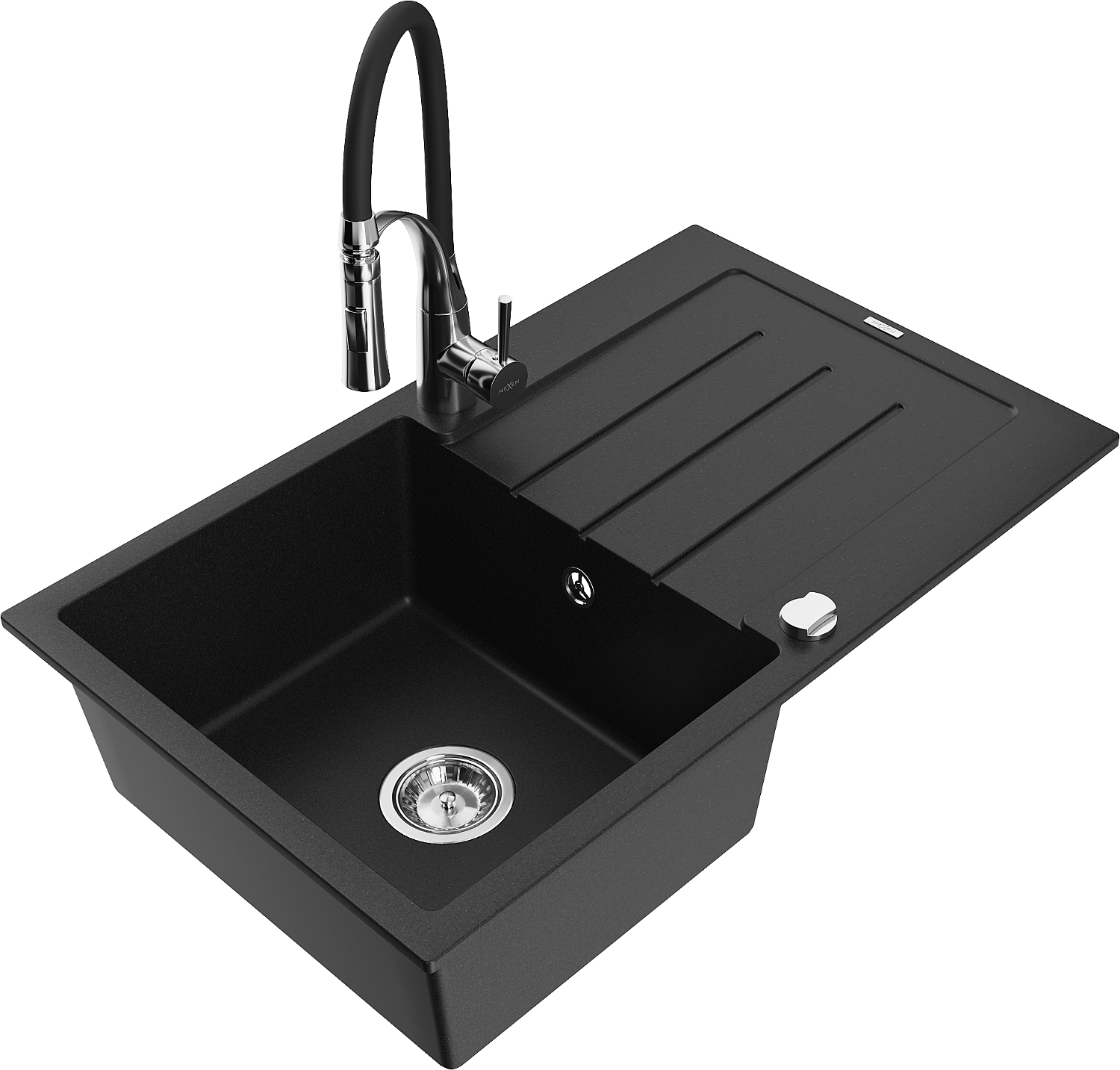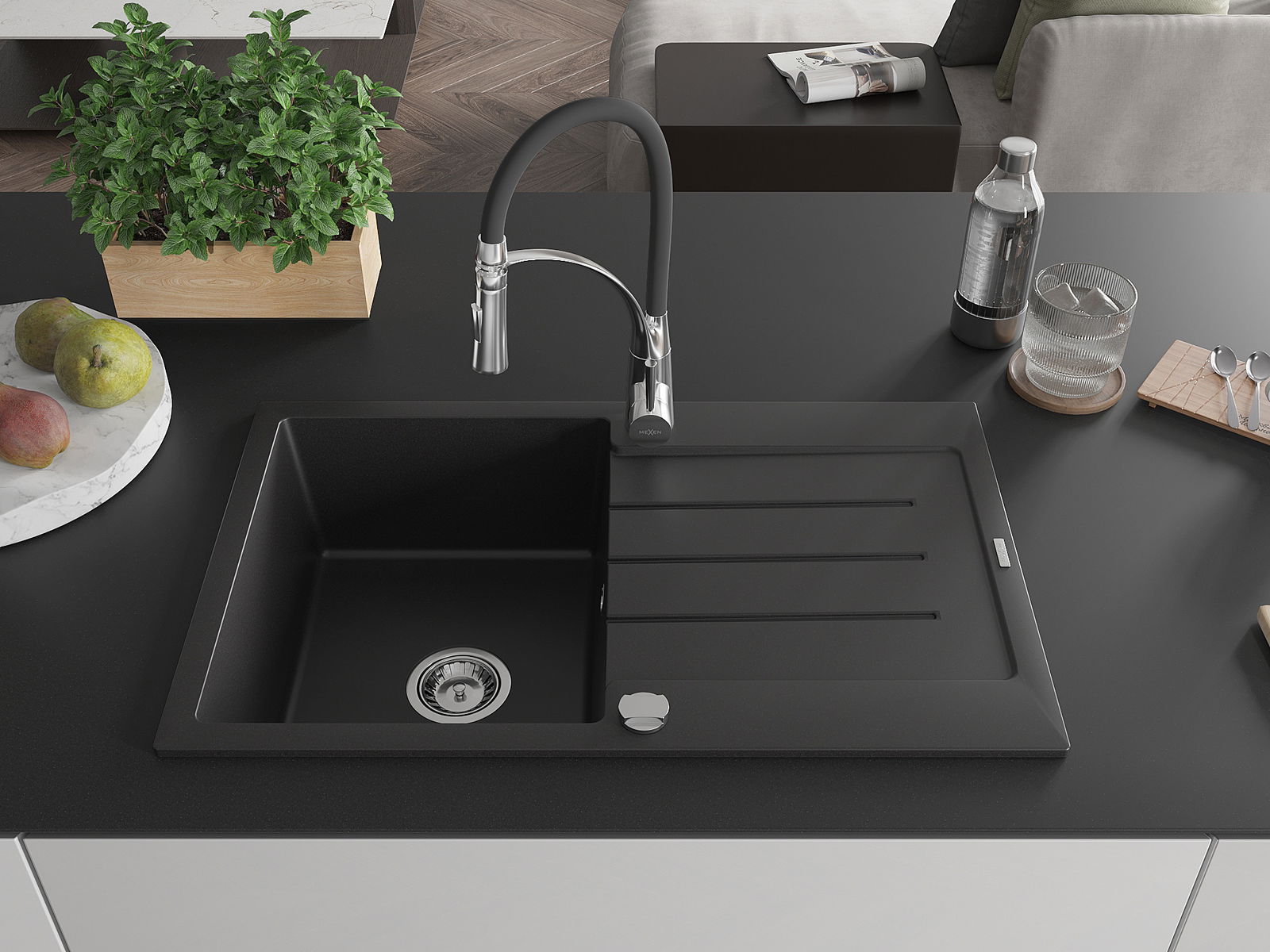 Mexen Bruno évier en granit 1 bac avec égouttoir et robinet de cuisine Aster, noir - 6513-77-73450-07