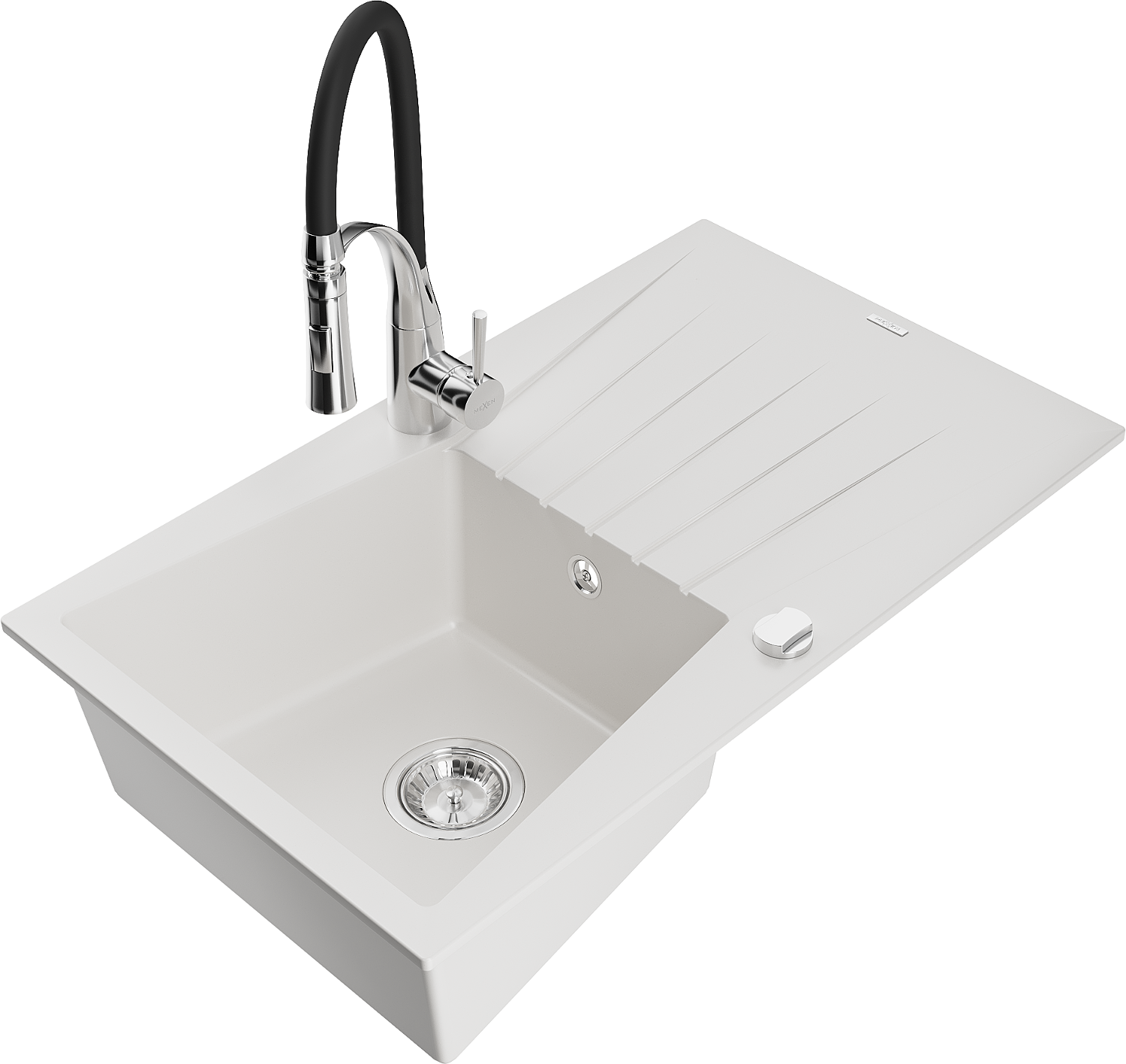 Mexen Cesar évier en granit 1 bac avec égouttoir et robinet de cuisine Aster, blanc - 6514-20-73450-07