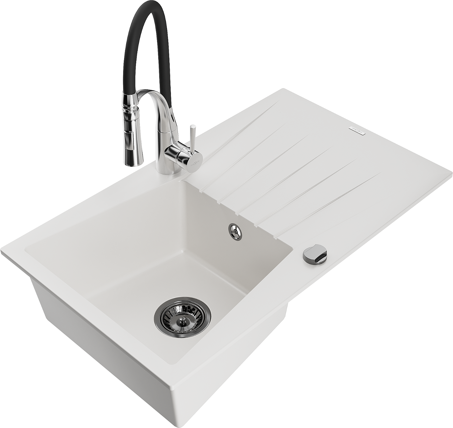 Mexen Cesar évier en granit 1 bac avec égouttoir et robinet de cuisine Aster, blanc - 6514-20-73450-07-B