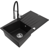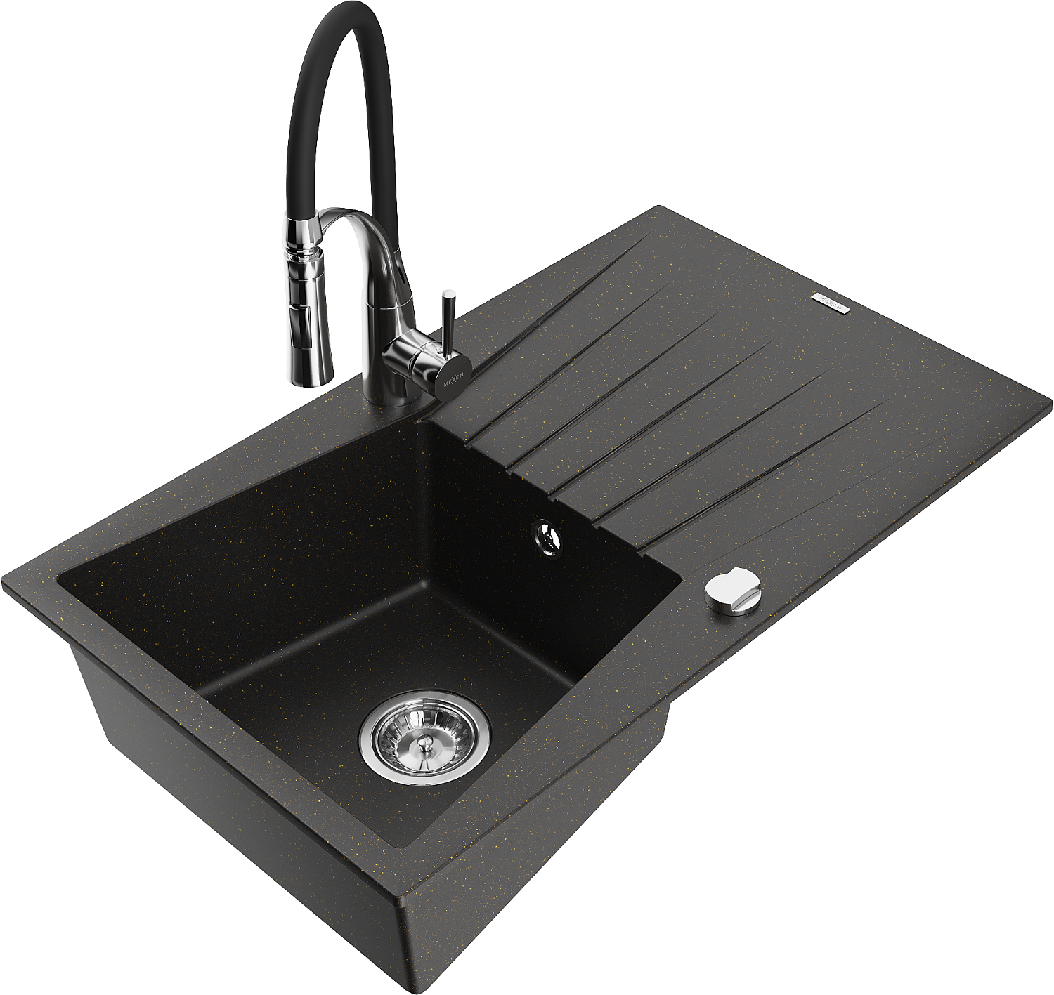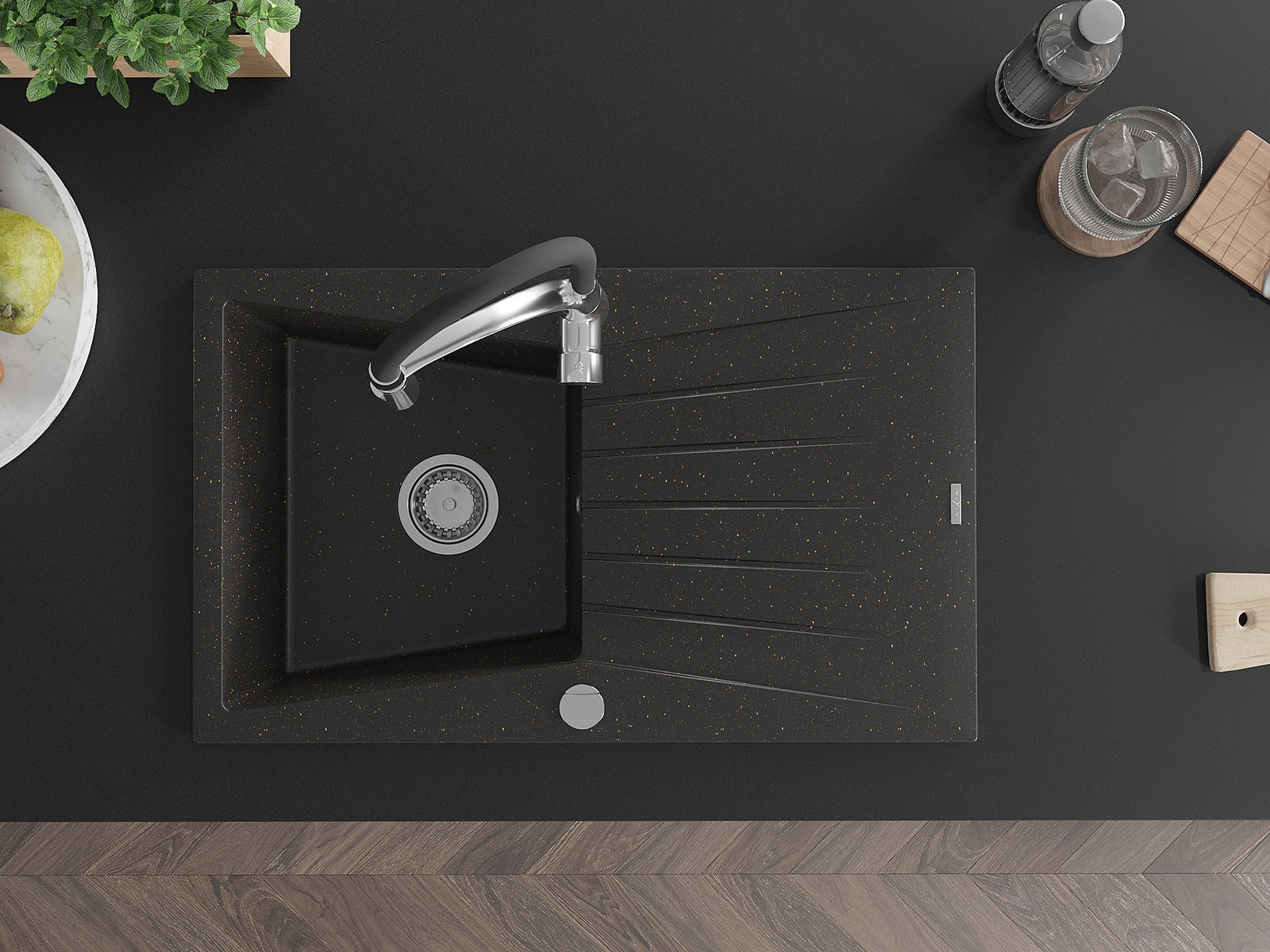 Mexen Cesar évier en granit 1 bac avec égouttoir et robinet de cuisine Aster, noir/métal doré - 6514-75-73450-07