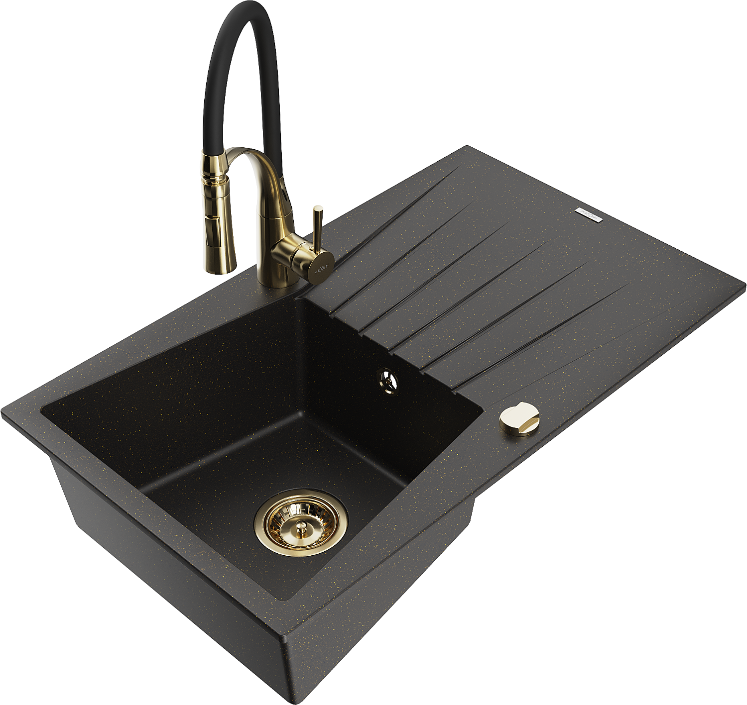 Mexen Cesar évier en granit 1 bac avec égouttoir et robinet de cuisine Aster, noir/or métallisé - 6514-75-73450-57-G